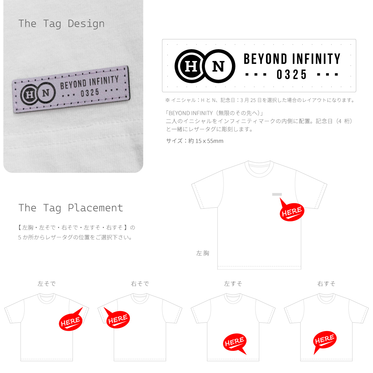 タグの取り付け位置は「左胸」「左そで」「右そで」「左すそ」「右すそ」の5か所からご選択いただけます。 <タグの彫刻内容> ◉左側のイニシャル ◉右側のイニシャル ◉記念月 ◉記念日
