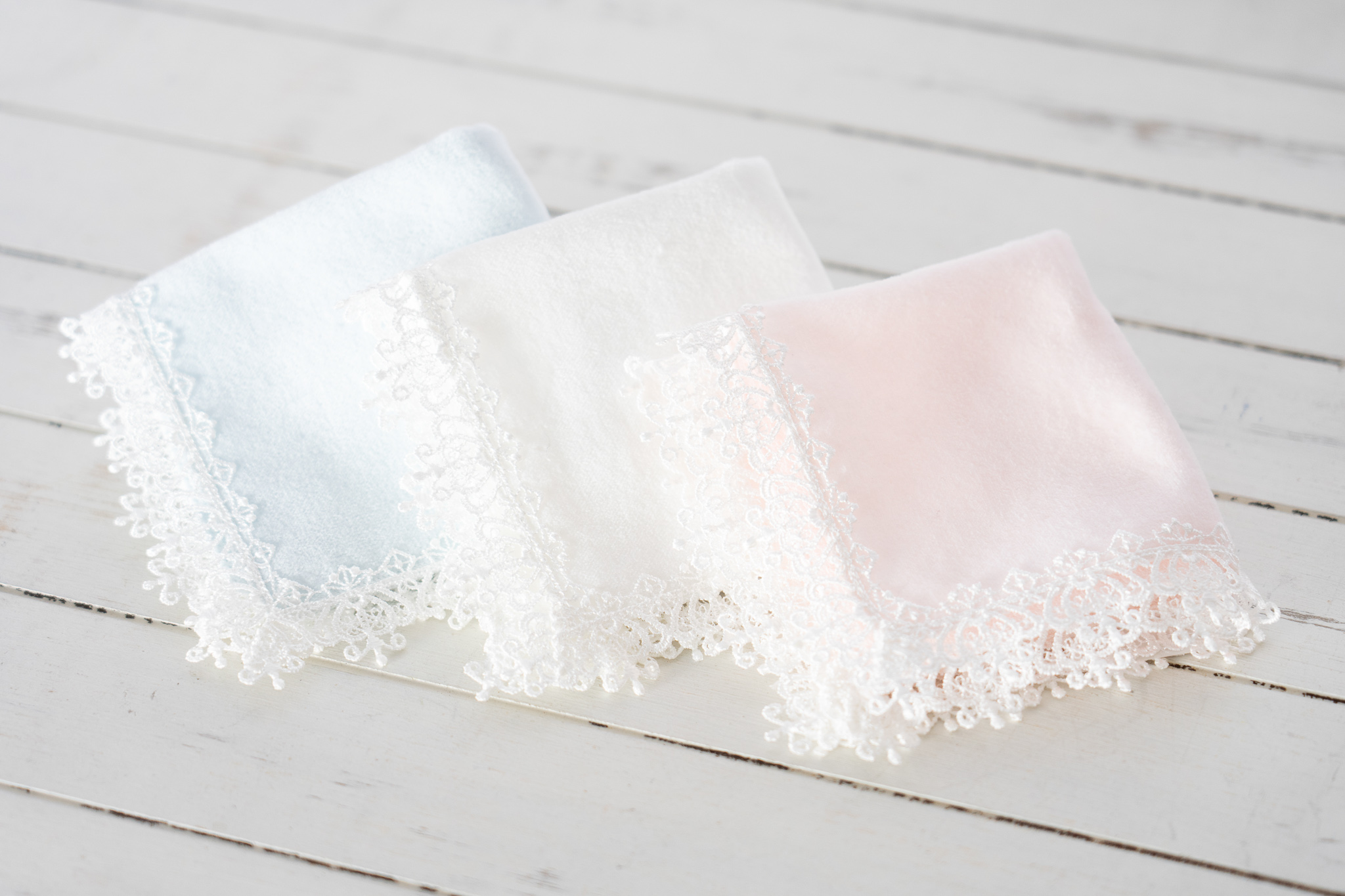 大口注文・法人のお問い合わせはこちら実用的で美しいハンカチをコンセプトに作られ、日本有数のタオル産地 今治産のタオル地を使用し、ふっくらとした肌触りが特徴的なタオルハンカチです。 表面にはパイルループをカットしたシャーリング加工を施し、ベルベットのような質感で高級感を演出しています。 タオルの周りに贅沢にあしらったレースが最大の魅力です。