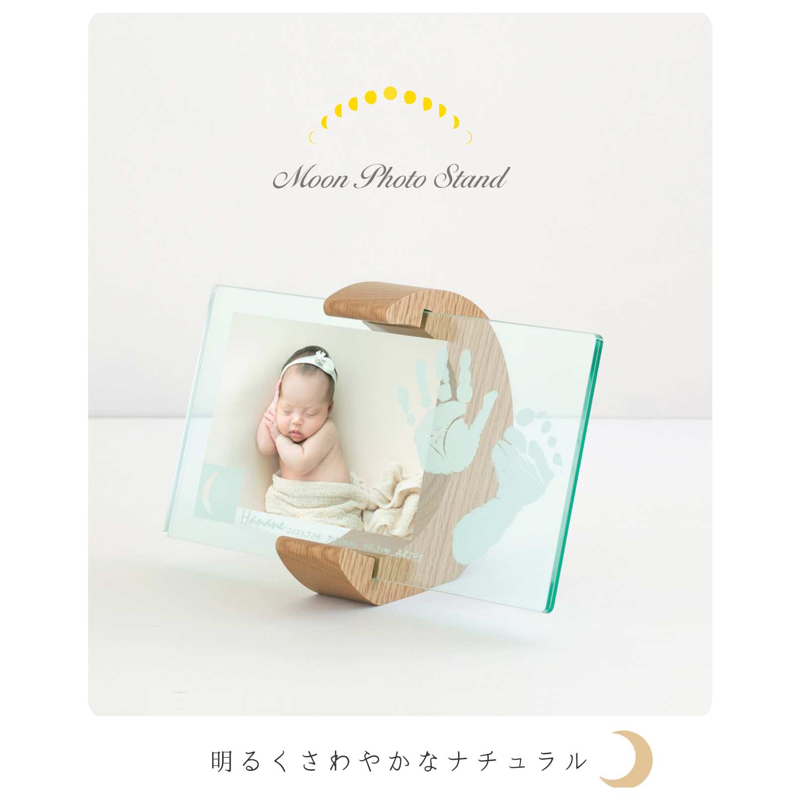 生まれた日の月のカタチを、ずっとそばに。赤ちゃんが誕生した日の「お月さまのカタチ」を刻印した、幻想的な世界観のメモリアル。三日月型のウッドスタンドは北海道・旭川の職人が1点ずつ手作りしています。ナラ材のもつ自然の風合いと、ガラス色の国産アクリルが織りなす調和は、まるでおしゃれなインテリアオブジェのよう。ナチュラル、ブラウンの2色から選べます。