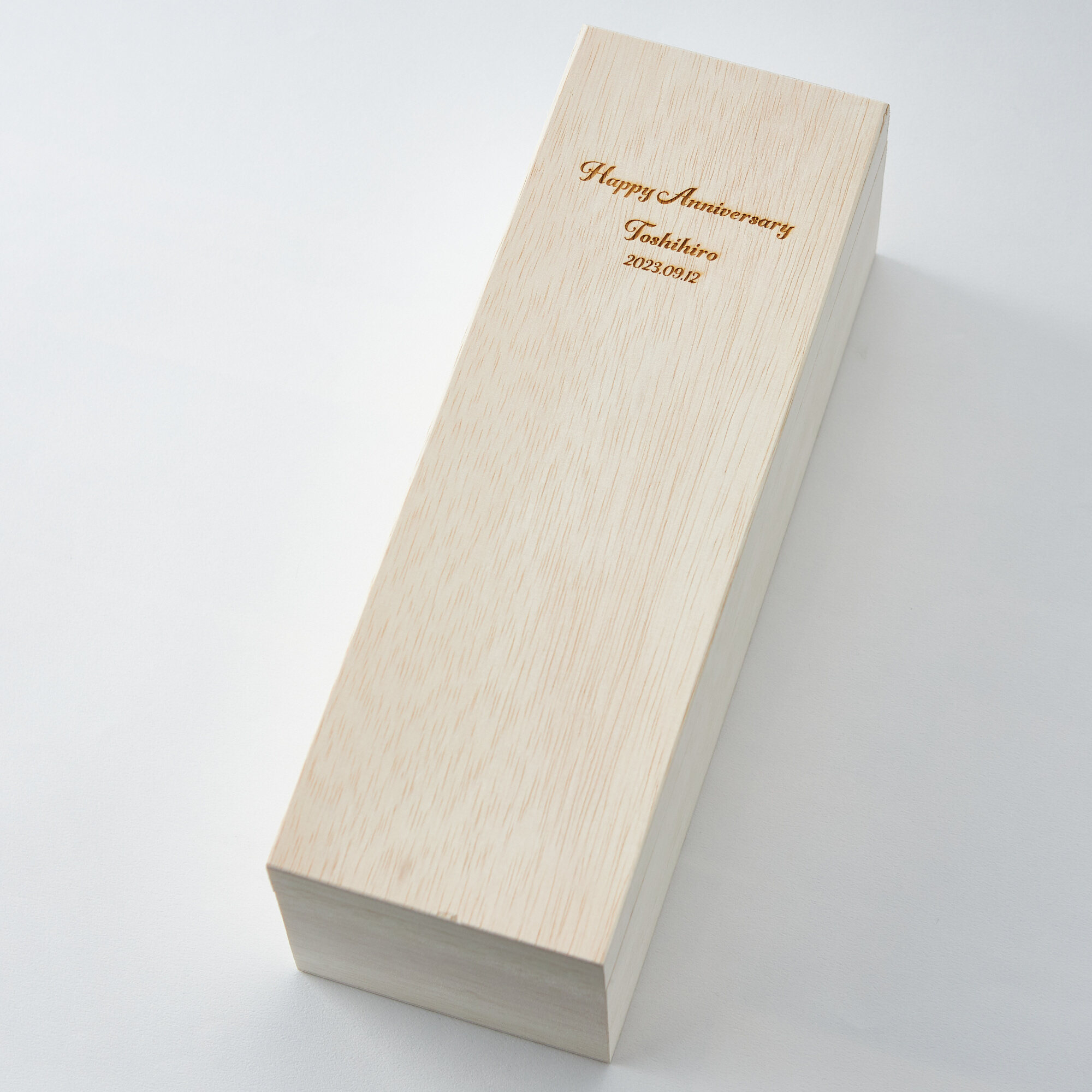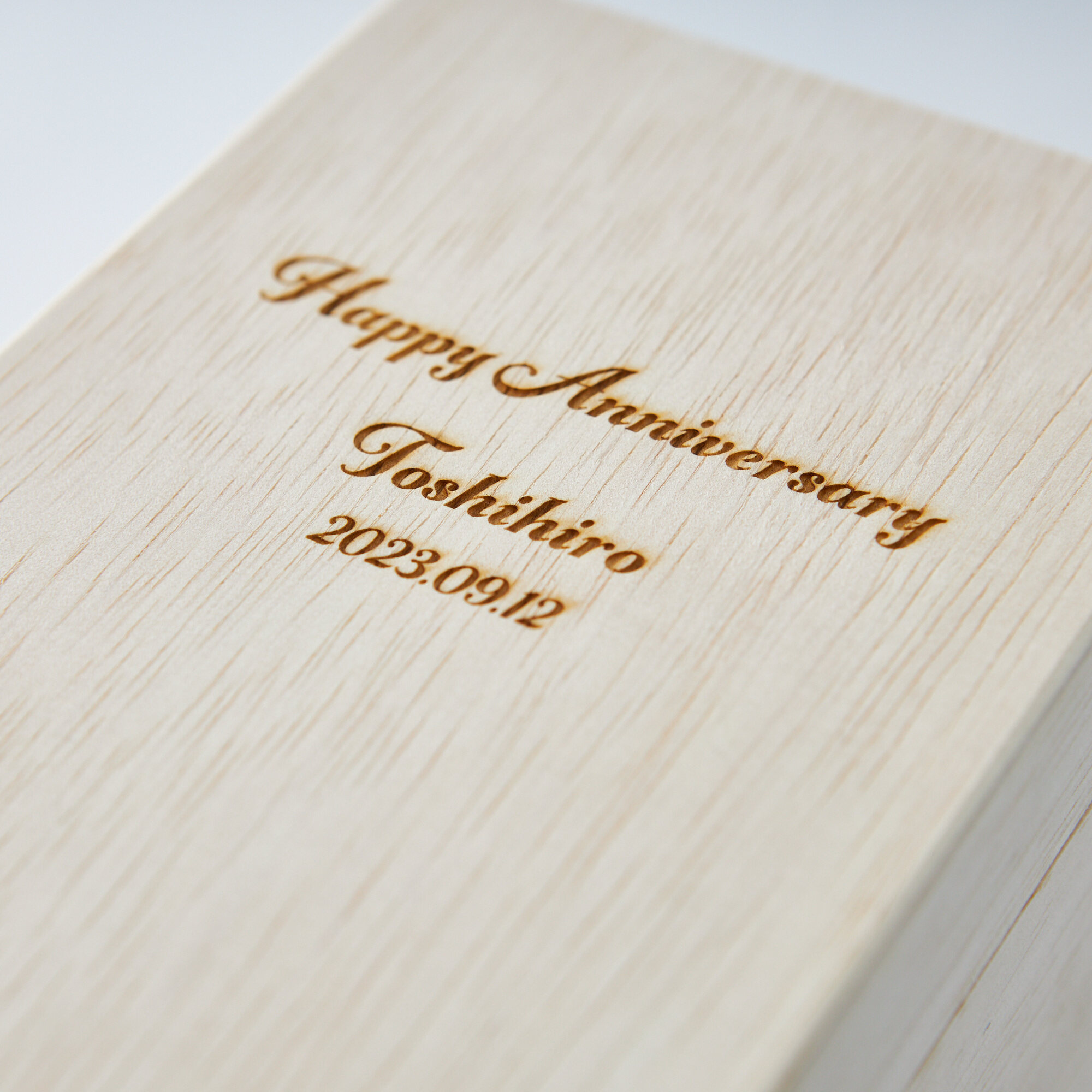 お酒を入れる木箱に大切な方のお名前や記念日をレーザー彫刻でお入れします。