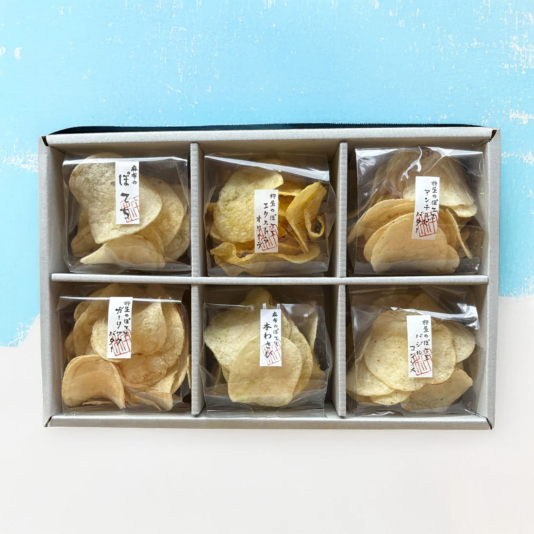 新商品""麻布のぽてち 本わさび""を含む、大人気「麻布のぽてち」シリーズ6種類を詰め合わせたギフトです。 ・エクストラオリーブ ・麻布のぽてち ・アンチョビバター ・ガーリックバター ・バジルコンソメ ・本わさび 各1袋入