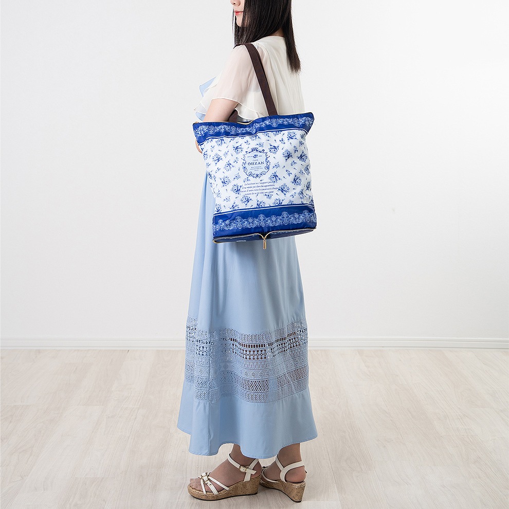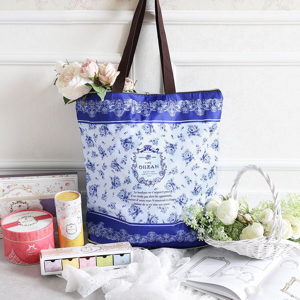 「CAFE OHZAN(カフェ オウザン)」オリジナルデザインの保冷バッグ。華やかなデザインでファッションのアクセントにもなるバッグは、コンパクトに折り畳みが出来るので持ち運びにもぴったり。隙間がなく冷気が逃げにくい構造で、チョコレート商品は保冷剤を入れて3時間程度のお持ち運びが可能です。