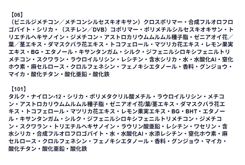 | ご使用上/安全上の注意 | [使用上の注意] ○お肌に異常が生じていないか、よく注意して使用して下さい。化粧品がお肌に合わないとき、即ち使用中や使用後に直射日光にあたって赤み、はれ、かゆみ、刺激、色抜け(白斑等)や黒ずみ等の症状があらわれた場合は使用を中止して下さい。そのまま化粧品の使用を続けますと、症状を悪化させることがありますので、皮膚科専門医等にご相談されることをおすすめします。 ○傷やはれもの、湿疹等、異常のある部位にはお使いにならないで下さい。 ○目に入らないようにご注意下さい。目に入った場合は、直ちに洗い流して下さい。 [保管及び取扱い上の注意] (1)使用後は必ずしっかり蓋をしめて下さい。 (2)乳幼児の手の届かないところに保管して下さい。 (3)極端に高温または低温の場所、直射日光のあたる場所には保管しないで下さい。 |