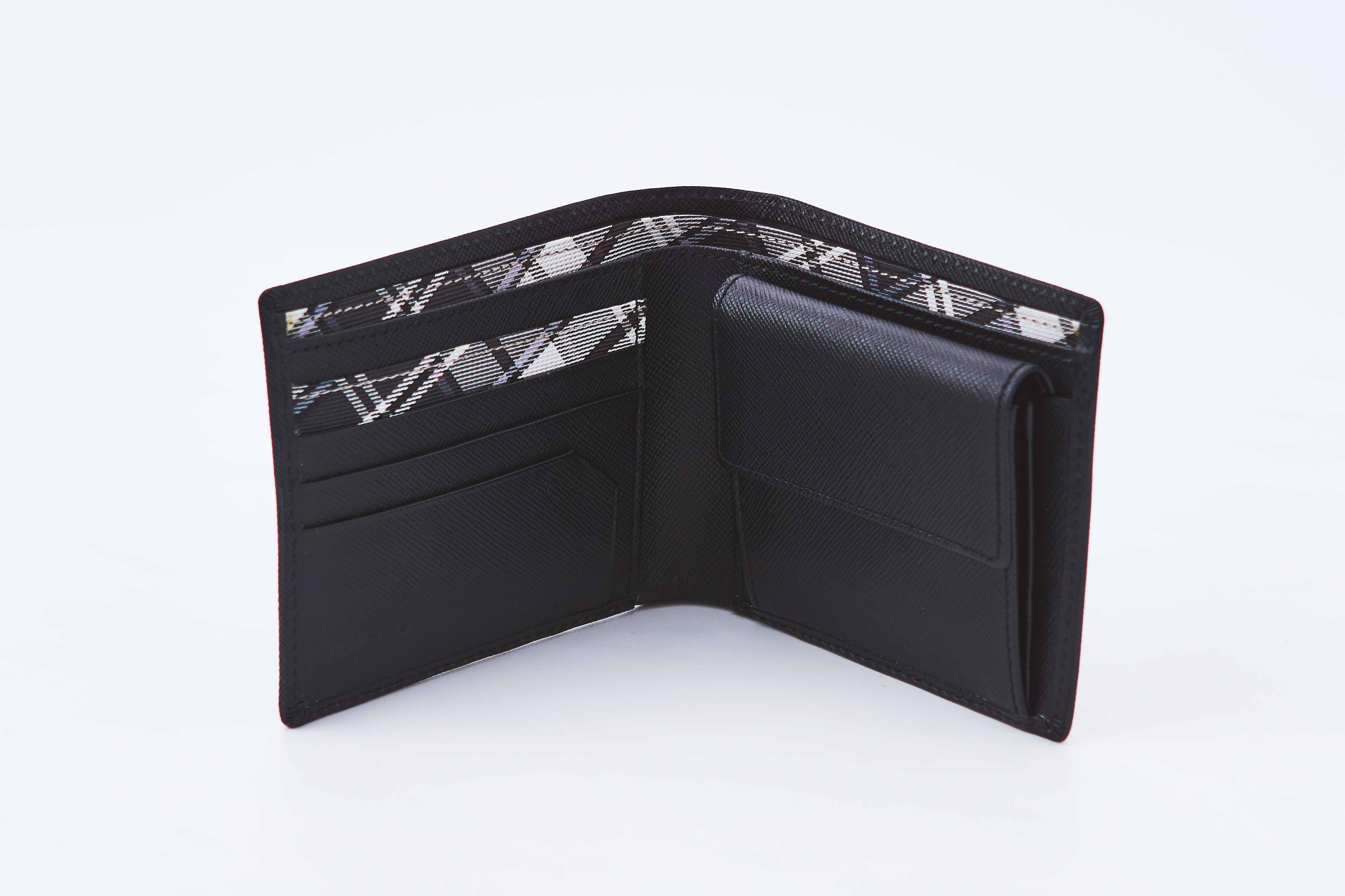 表はシンプルなエンボス加工のみで仕上げ、広げた時に、タータンチェックが目を惹くおしゃれで、使い勝手がよく、デザイン性を兼ね揃えた財布。