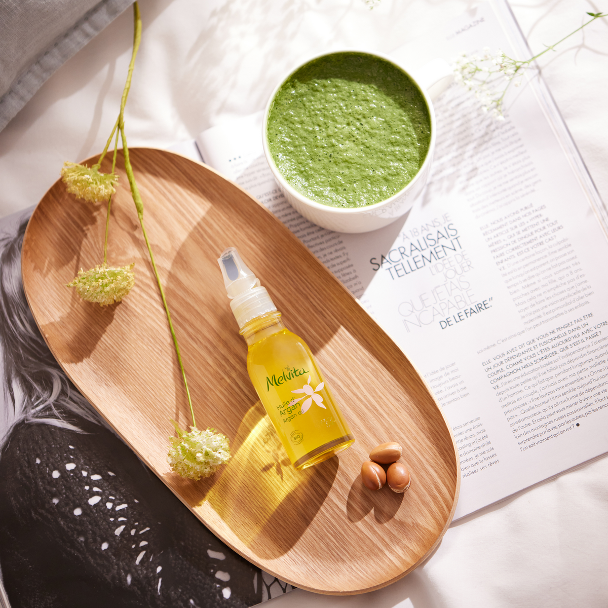 洗顔後すぐのオイルでもちもちの美肌へ。 洗顔後のまっさらな肌に、ブースターとしてアルガンオイルをひと塗り。 オイルがスーッと肌になじみ、その後に使う化粧水のうるおいをしっかりと抱えこみます。肌の角質層内にある細胞間脂質は、油分層が水分層を挟みこむような構造でうるおいを守っています。 そのため保湿には、水分のみならず、オイルが欠かせません!