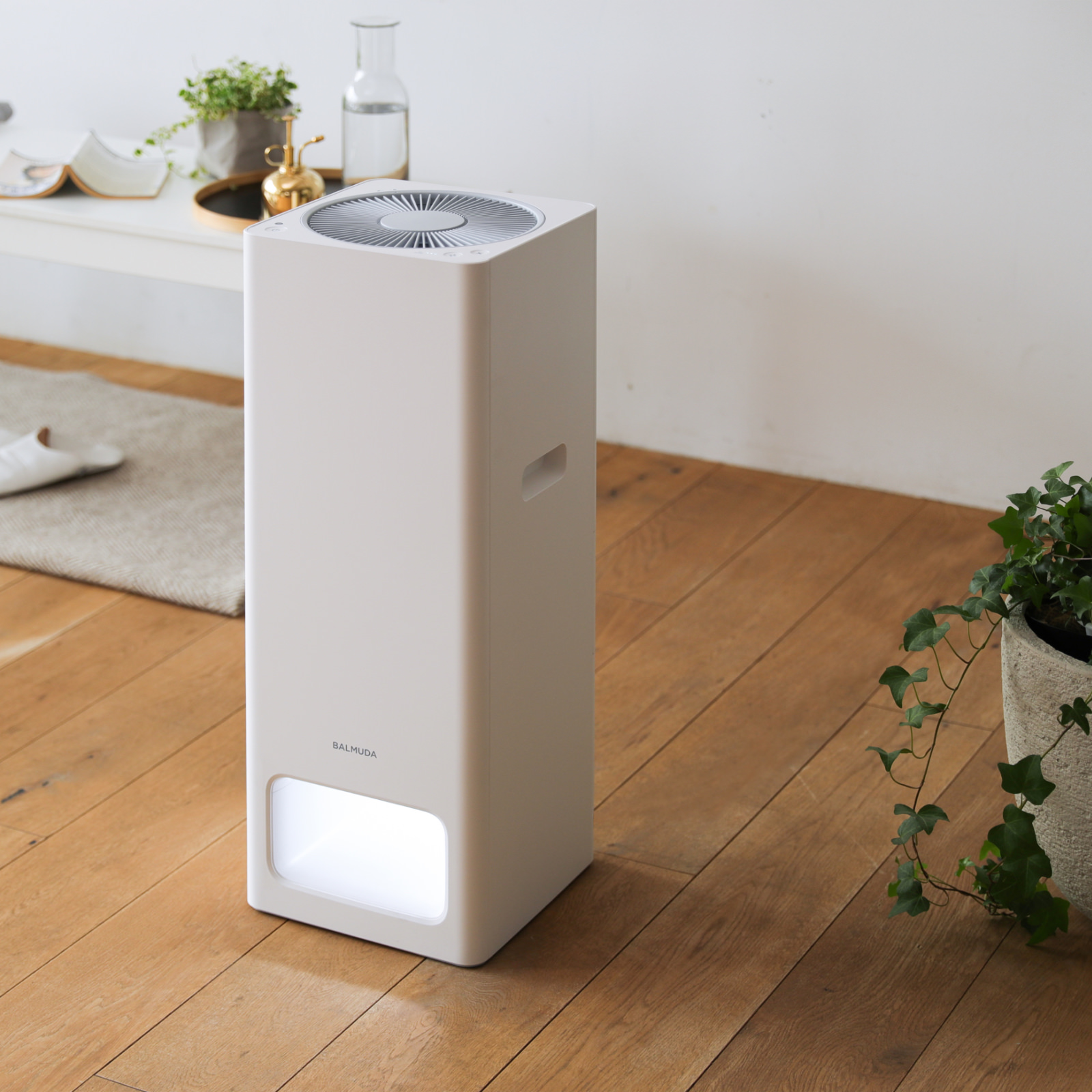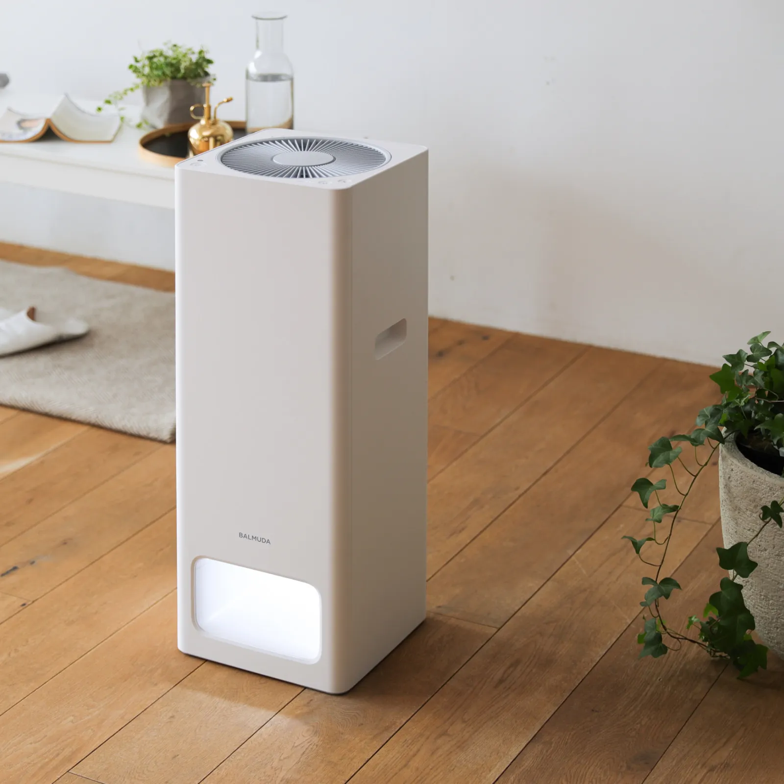 BALMUDA The Pure は、吸気口と流路が点灯し、この光の柱を通って空気が清浄されていきます。そして本体のデザインは極力シンプルに。さまざまな部屋と調和するようにデザインしました。