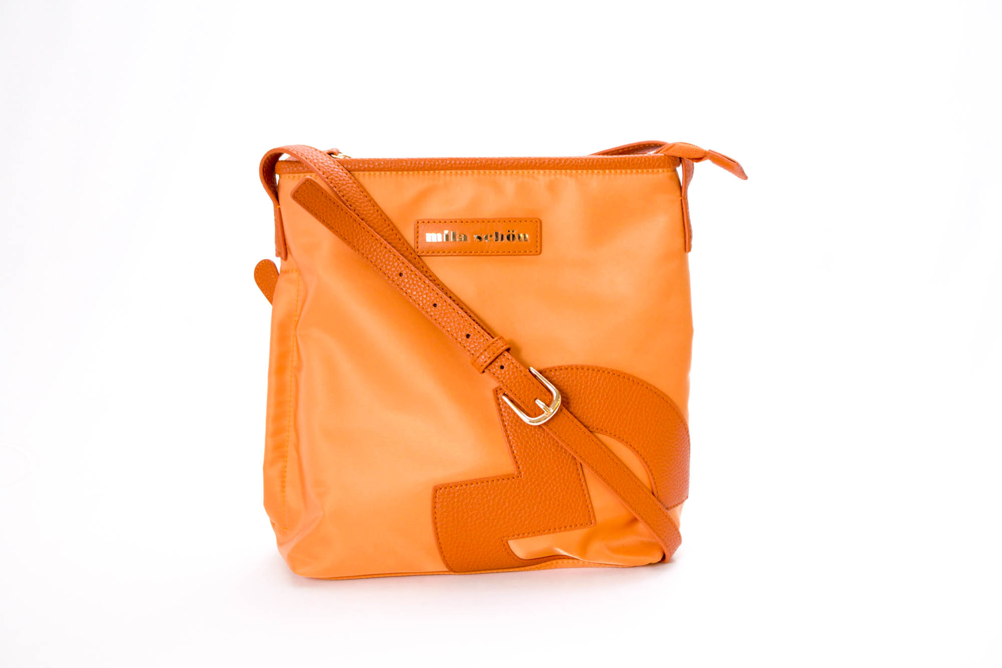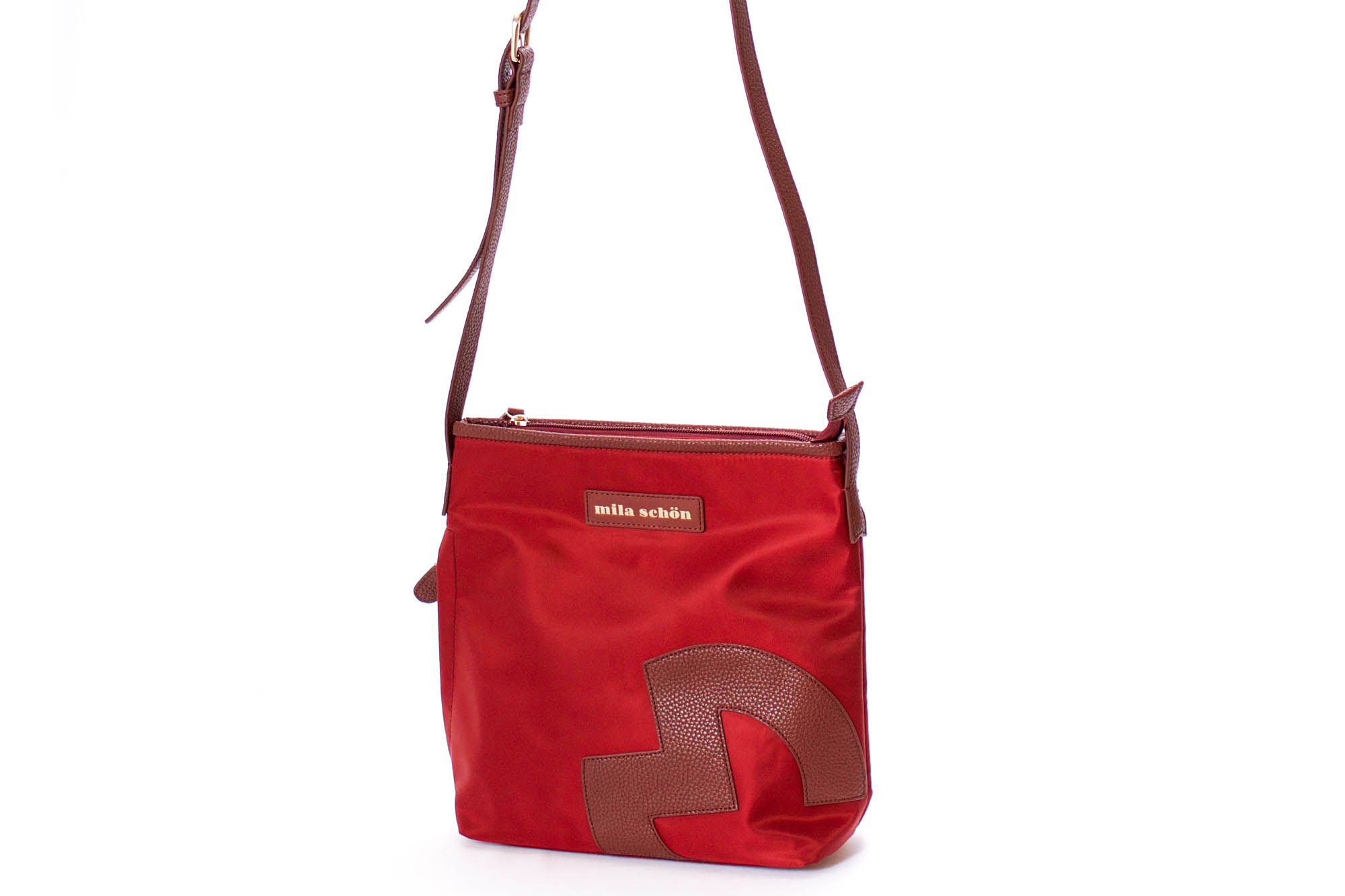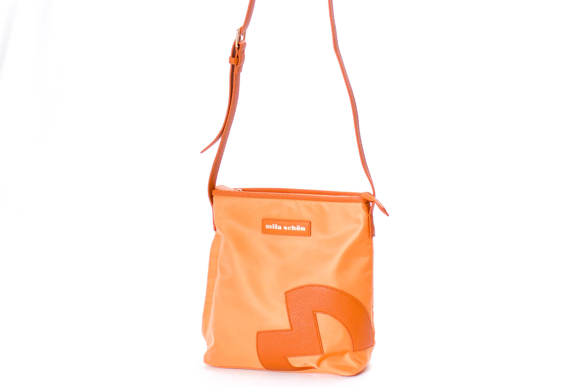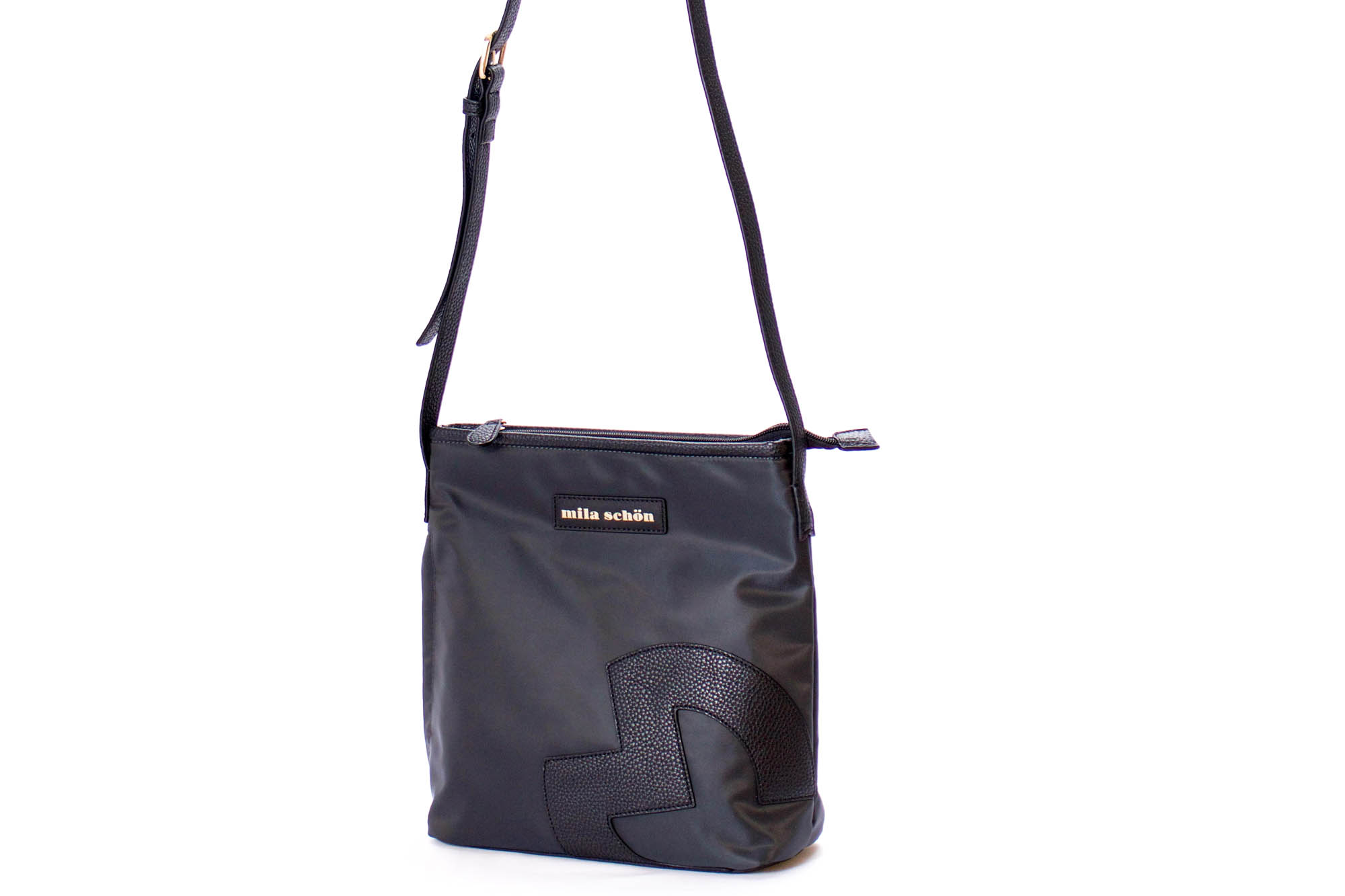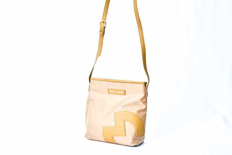 ミラ・ショーンの「M」マークをアレンジし、パッチワークで大胆にデザインしています。品のあるロゴプレートとシンプルなワンポイントの素材を変える事でオシャレを演出しています。縦型の斜め掛けショルダーバッグは、マチ幅が広く、ポケットの数も多いので収納力が抜群。デイリーで使いやすいアイテムです。