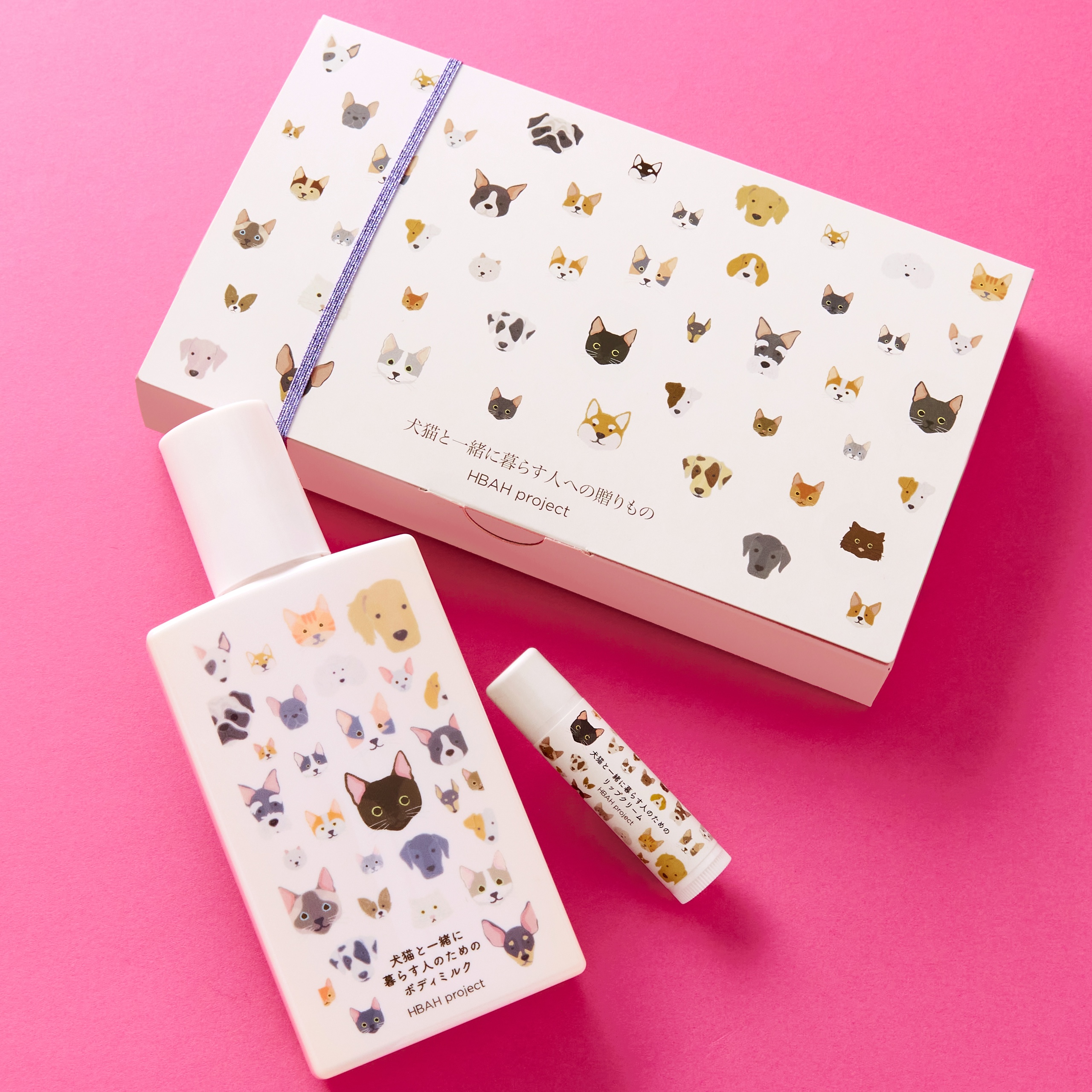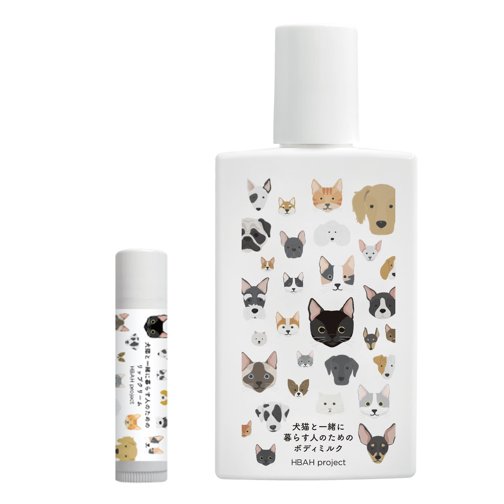 大口注文・法人のお問い合わせはこちら乾燥しがちな肌を潤すボディミルクと、デリケートな唇を守るリップクリームをセットに。「ペットが舐めても安心」な優しい処方だから、顔まわりでペットとじゃれあう時も心配いりません。肌と唇への潤いはもちろん、ペットと気兼ねなくふれあえる、穏やかで幸せな時間を贈ります。