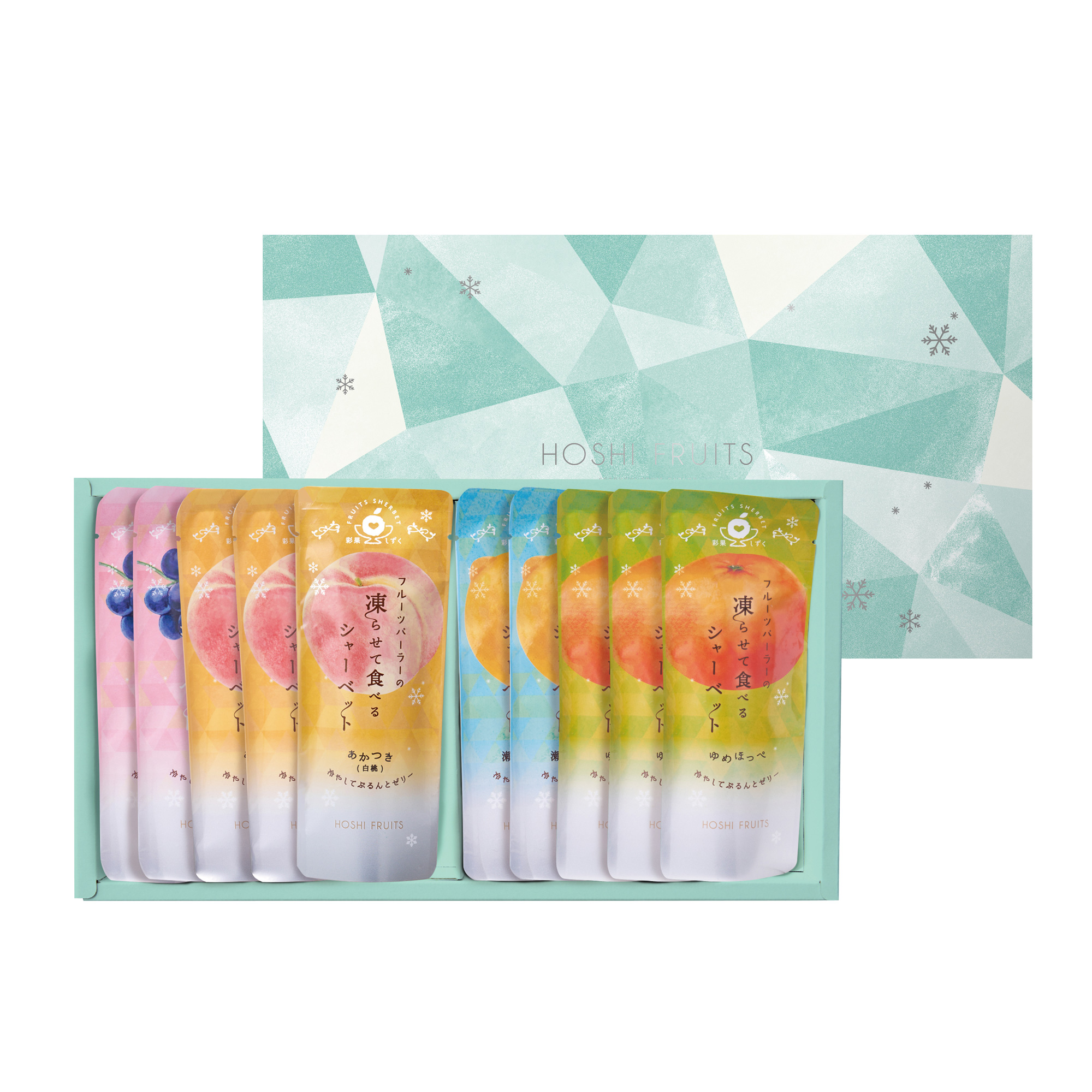 大口注文・法人のお問い合わせはこちらフルーツ専門店のホシフルーツがお届けする、凍らせて食べる新感覚のスイーツ「彩果しずく」10袋入りギフトです。そのまま食べればぷるんと食感の爽やかなジュレとして、凍らせればひんやり&ねっとり食感の濃厚シャーベットとしてお楽しみいただけます。夏の贈り物や、ご家族皆様で楽しむデザートにぴったりな一品です。