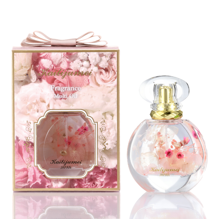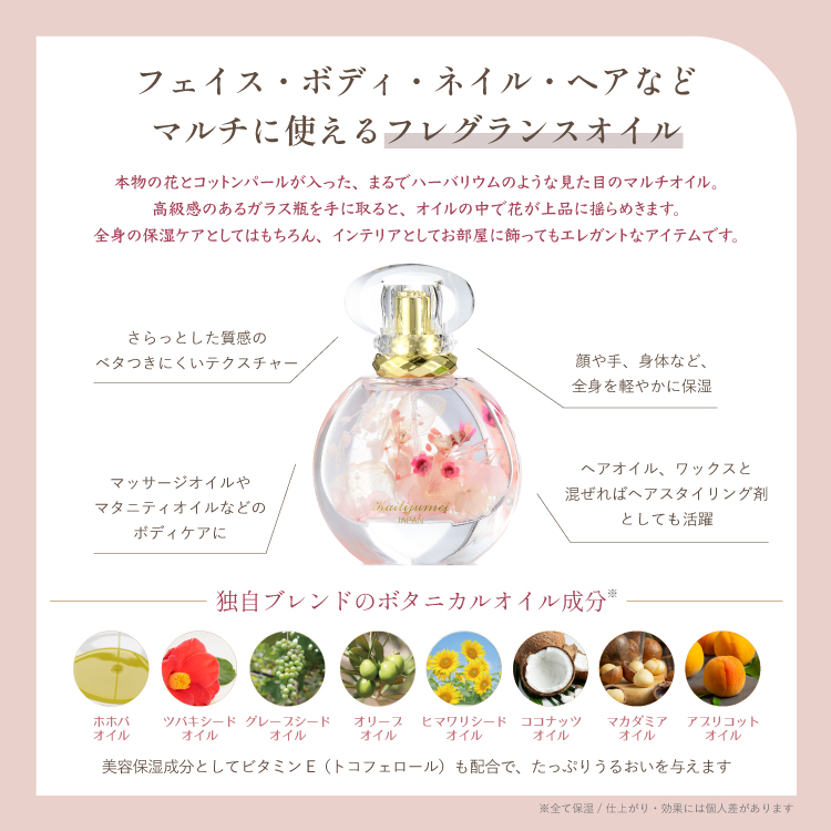 大口注文・法人のお問い合わせはこちら高級感のあるガラス瓶を手に取ると、オイルの中で花が上品に揺らめきます。 さらっとした質感のベタつきにくいテクスチャーで、顔や手、身体など、全身を軽やかに保湿します。