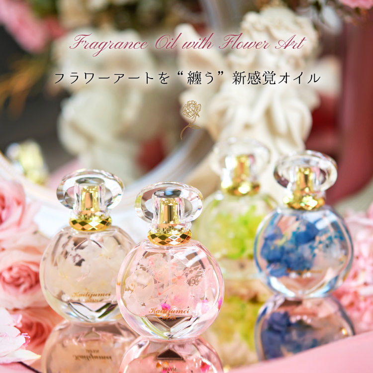 フラワーアートを”纏う”新感覚オイル。本物のお花とコットンパールが入った、まるでハーバリウムのような見た目の香りつきマルチオイル。オイルの中で花が上品に揺らめきます。全身の保湿ケアとしてはもちろん、インテリアとしてお部屋に飾ってもエレガントなアイテム。