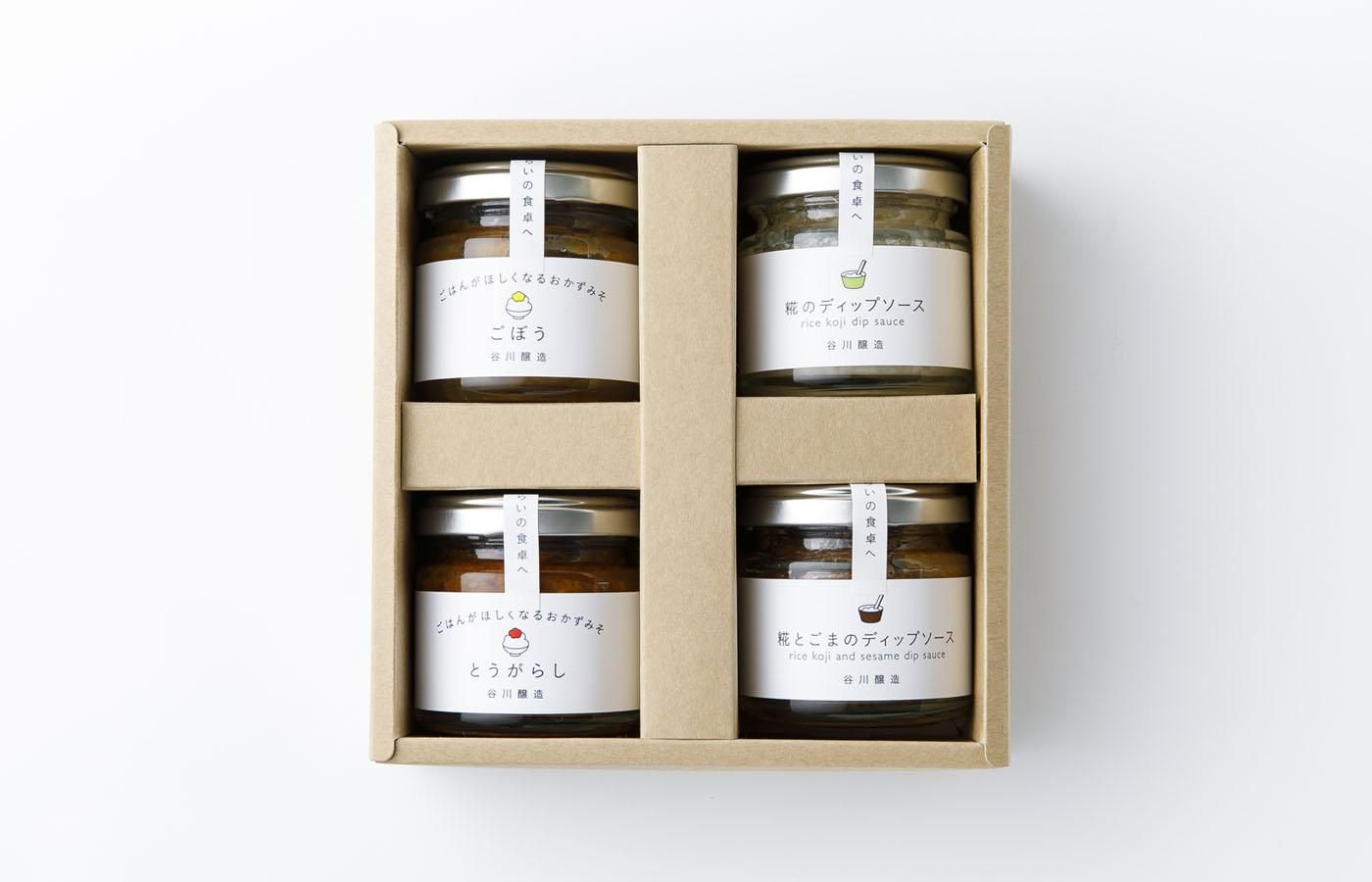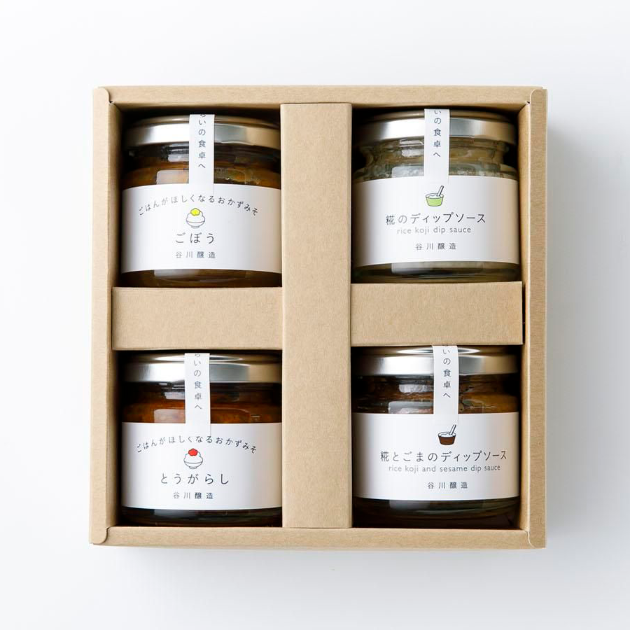 | 内容量/数量 | おかずみそ(ごぼう・とうがらし)80g×各1個、糀のディップソース70g×1個、糀とごまのディップソース70g×1個 |