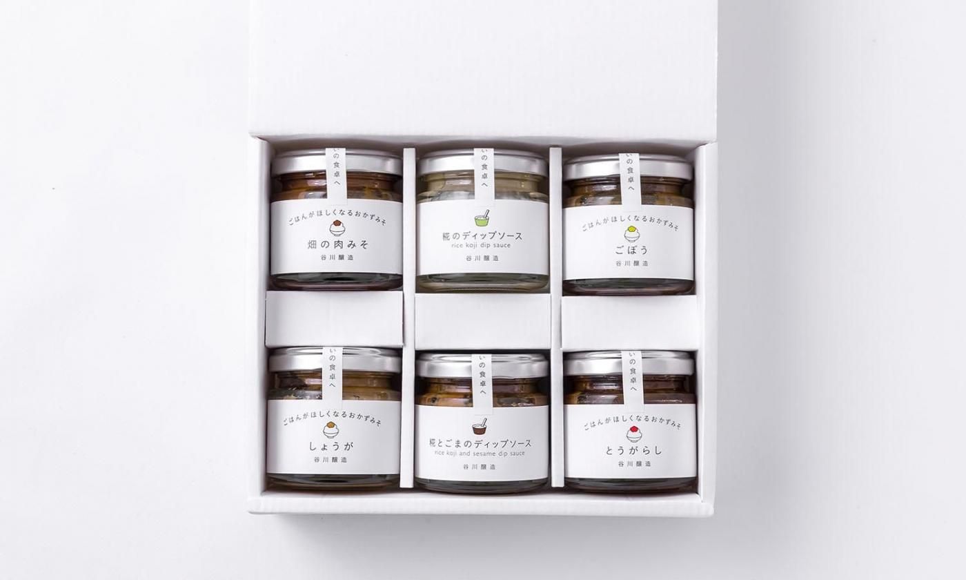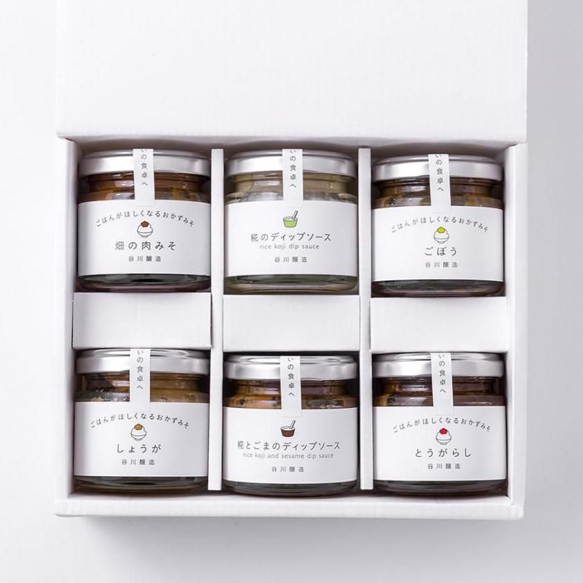 | 内容量/数量 | おかずみそ(ごぼう・とうがらし・しょうが・畑の肉みそ)80g×各1個、糀のディップソース70g×1個、糀とごまのディップソース70g×1個 |