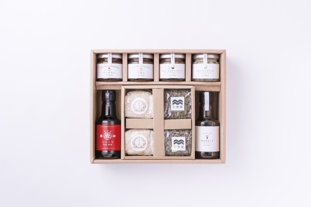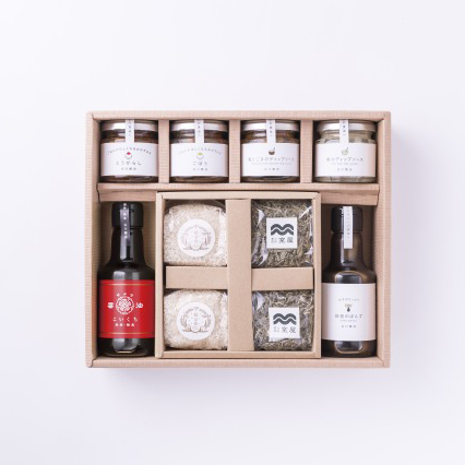 | 内容量/数量 | 能登のぽんず145ml×1本、サクラ醤油(こいくち)145ml×1本、糀のディップソース70g×1個、糀とごまのディップソース70g×1個、おかずみそ(ごぼう・とうがらし)80g×各1個、室屋のとろろこんぶ20g×2個、稲ほ舎のお米1合パック×2個 |