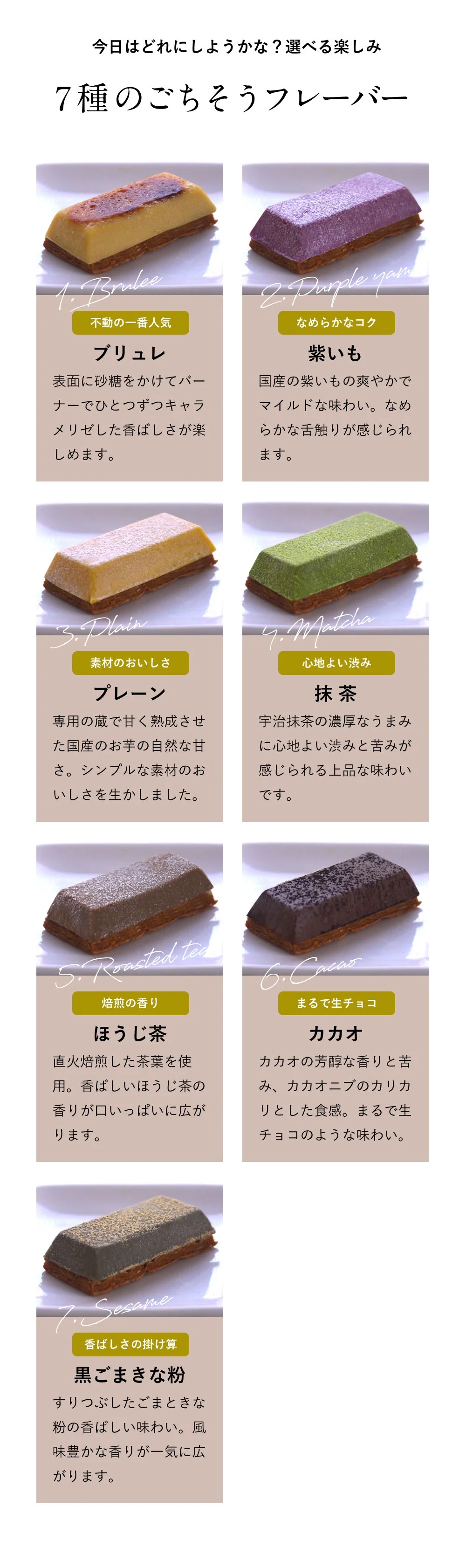 | 原材料 | 【プレーン】さつまいも(国産)、砂糖、バター、小麦粉、生クリーム、植物性油脂、脱脂濃縮乳、粉糖 【紫いも】さつまいも(国産)、砂糖、紫芋、 バター、小麦粉、生クリーム、植物性油脂、脱脂濃縮乳、粉糖、 【ブリュレ】さつまいも(国産)、砂糖、バター、小麦粉、生クリーム、植物性油脂、脱脂濃縮乳、 【抹茶】さつまいも(国産)、砂糖、バター、小麦粉、生クリーム、植物性油脂、脱脂濃縮乳、緑茶、粉糖、 【カカオ】さつまいも(国産)、砂糖、バター、カカオ豆、牛乳、小麦粉、 生クリーム、植物性油脂、 脱脂濃縮乳、 【黒ごまきな粉】さつまいも(国産)、砂糖、バター、小麦粉、生クリーム、黒ごま、大豆、 【ほうじ茶】さつまいも(国産)、砂糖、バター、小麦粉、 生クリーム、植物性油脂、脱脂濃縮乳、緑茶、 粉糖 、(一部に乳成分、小麦、大豆、ごまを含む) |