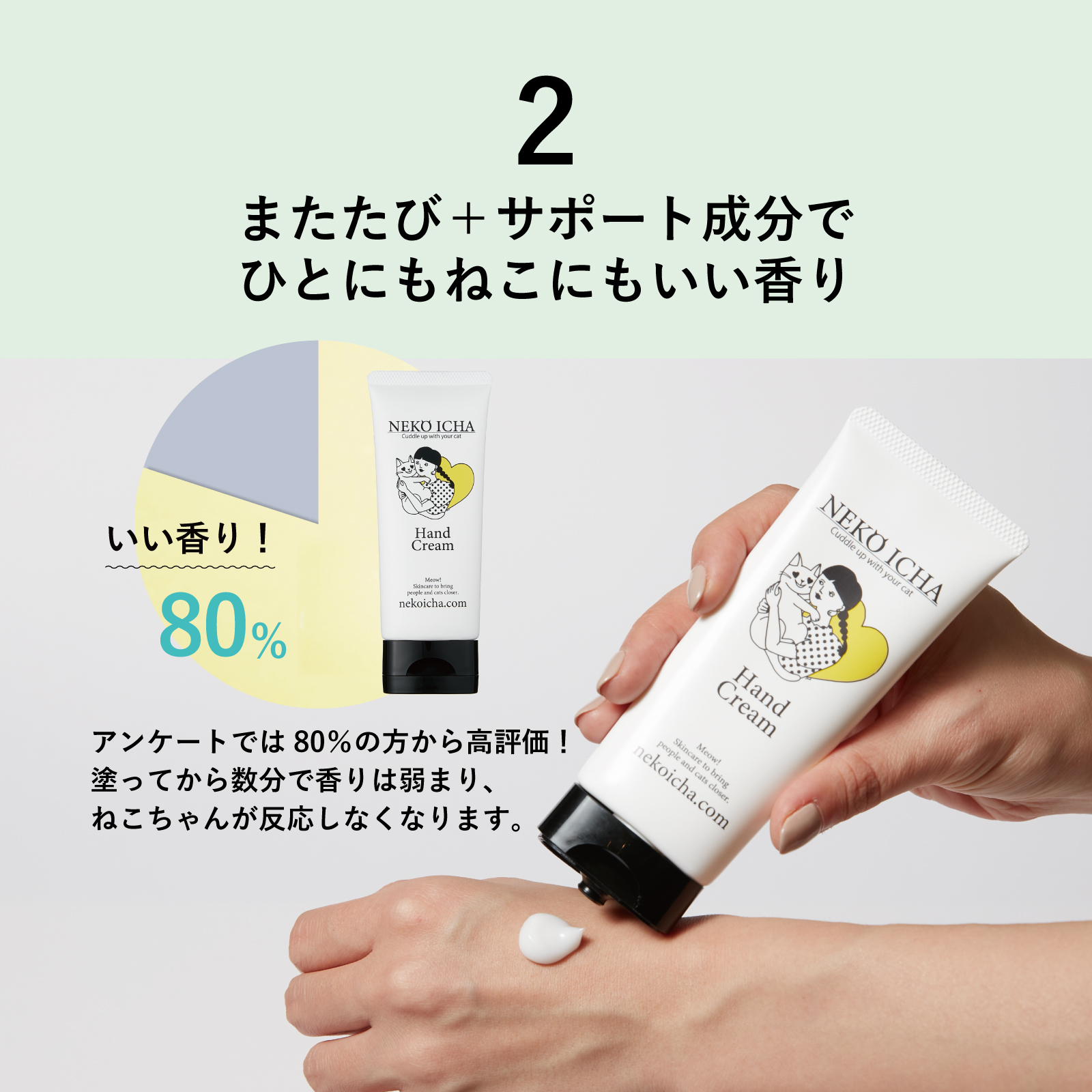 ひとが使うコスメには、ひとには問題がなくてもねこにとっては配慮されていないものがあります。 ねこにとって危険な物質はあまりに多く、ねこと暮らすひとが安心して使えるコスメが圧倒的に少ない現状。 香りも危険なものが多く、香水や精油などの香り付きのコスメは使えないのがねこオーナーさまのお悩みでした。 そこで、あえてねこが喜ぶ香りをつけたハンドクリームを開発いたしました。