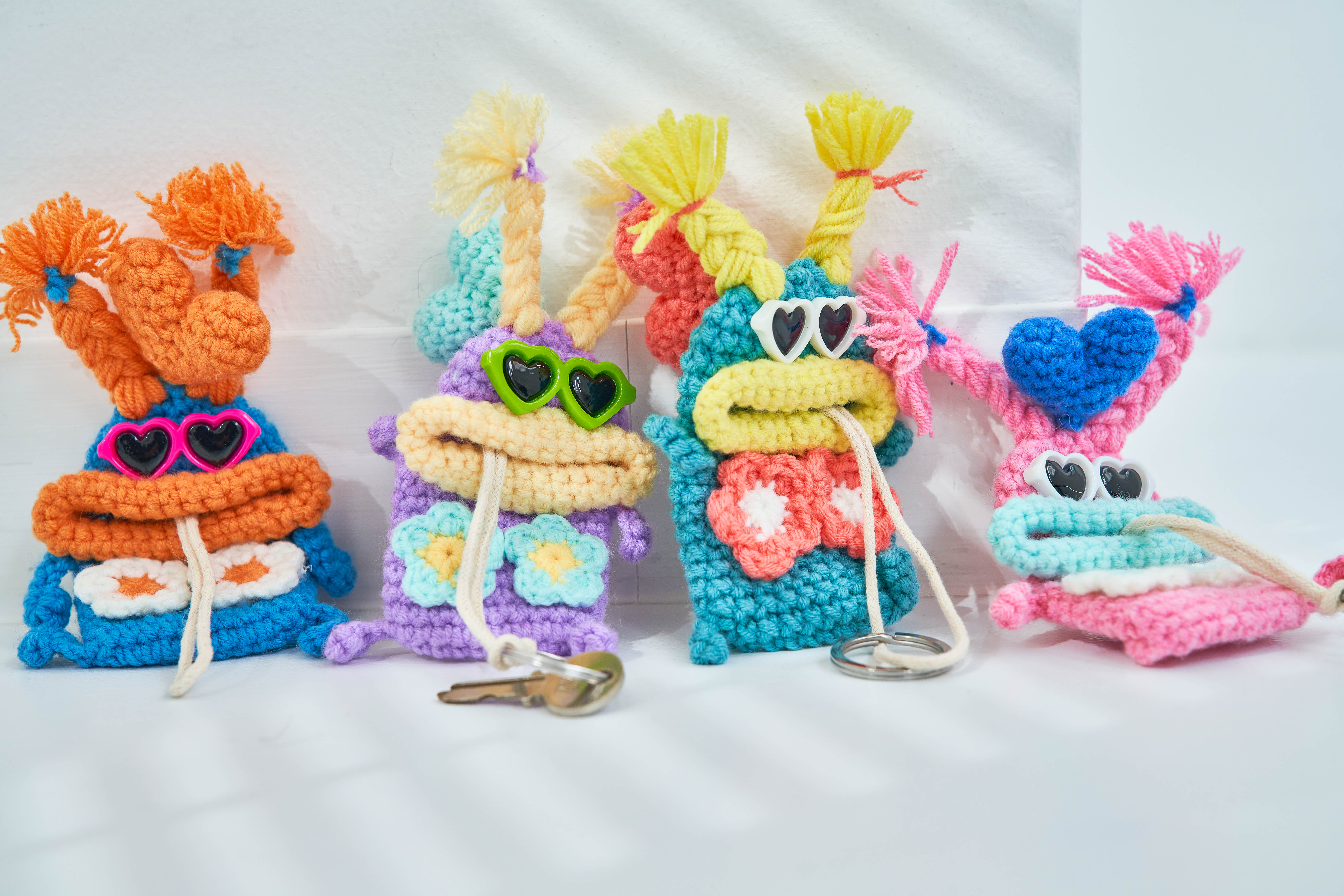 エッジの効いたアクセサリーやファッション雑貨を提案する「macaroni edge(マカロニエッジ)」のお花とサングラスがキュートな毛糸のマスコットキーケース。使用しないときはハートを引っ張ると鍵がモンスターの口の中へ。モンスターのお腹に合うサイズなら車のような大きな鍵でも傷つけず収納できます。