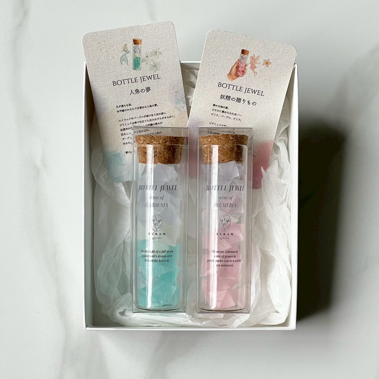大口注文・法人のお問い合わせはこちらある星降る夜、ひとすじの光が森を照らし、静かに夢が目を覚ます。 それは——人魚の深い記憶と、妖精のやさしい願い。 ふたつの夢は、時空を越えて静かに出逢い、あなたの手のひらへと届きました。 「宝石箱 ─ 光と夢 ─」は、まるで物語の一節を閉じ込めたような、幻想的な宝石石鹸のギフトセットです。 繊細な色彩、やさしい香り、そして詩のようなストーリーカードが受け取った人の心にそっと光を灯します。 <セット内容> ボトルジュエル ― 人魚の夢 ― ボトルジュエル ― 妖精の贈り物―
