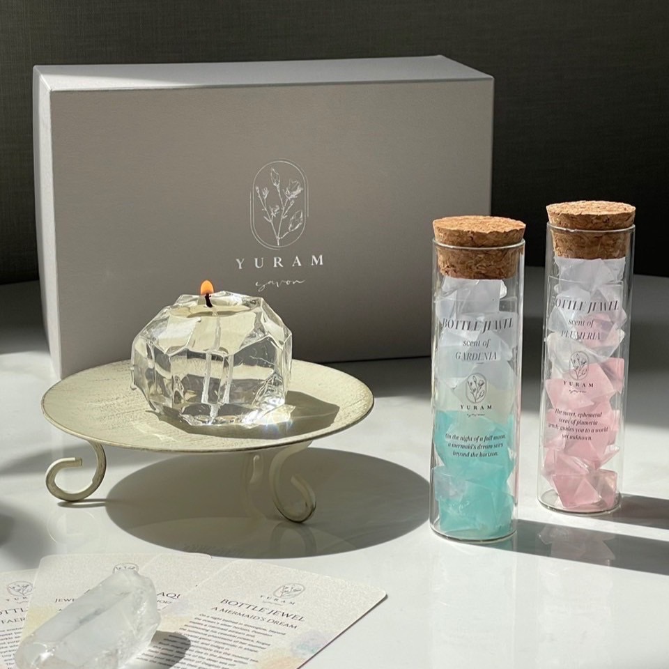 ブルー、パープル、ホワイトの幻想のかけらたち。 人魚が見た夢の断片を集めたような、美しく静かな世界を閉じ込めました。 香りは「ガーデニア」 花言葉は “幸せを運ぶ” やわらかく清らかな香りが、忘れていた夏の記憶をやさしく呼び覚まします。