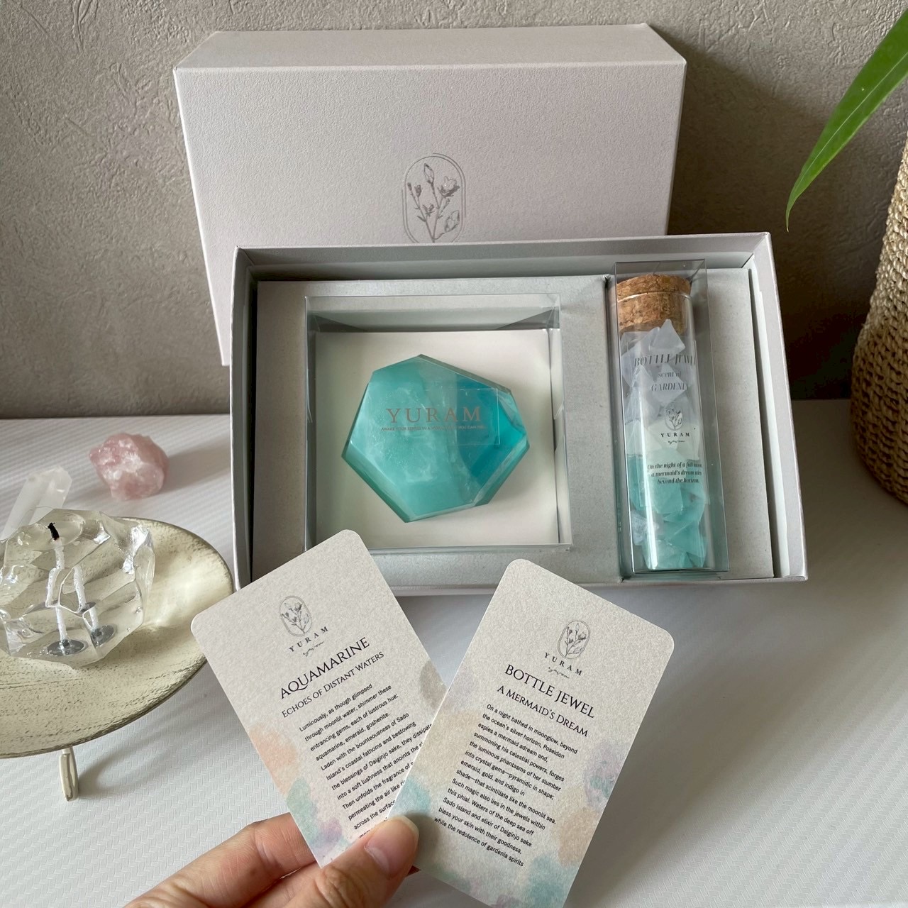 月明かりに照らされた夜の海。 静かな波音にのって、人魚のささやきのようにどこか懐かしい記憶がそっと胸をかすめる。 それは夢のようでもあり、過去や未来からの贈りもののようでもある—。 そんな静かな瞬間を贈りたい。 「宝石箱 人魚の記憶」は、幻想的な香りと輝きを閉じ込めた、あなたや大切な誰かのためのギフトセットです。 <セット内容> 宝石石鹸 水の記憶 ボトルジュエル 人魚の夢