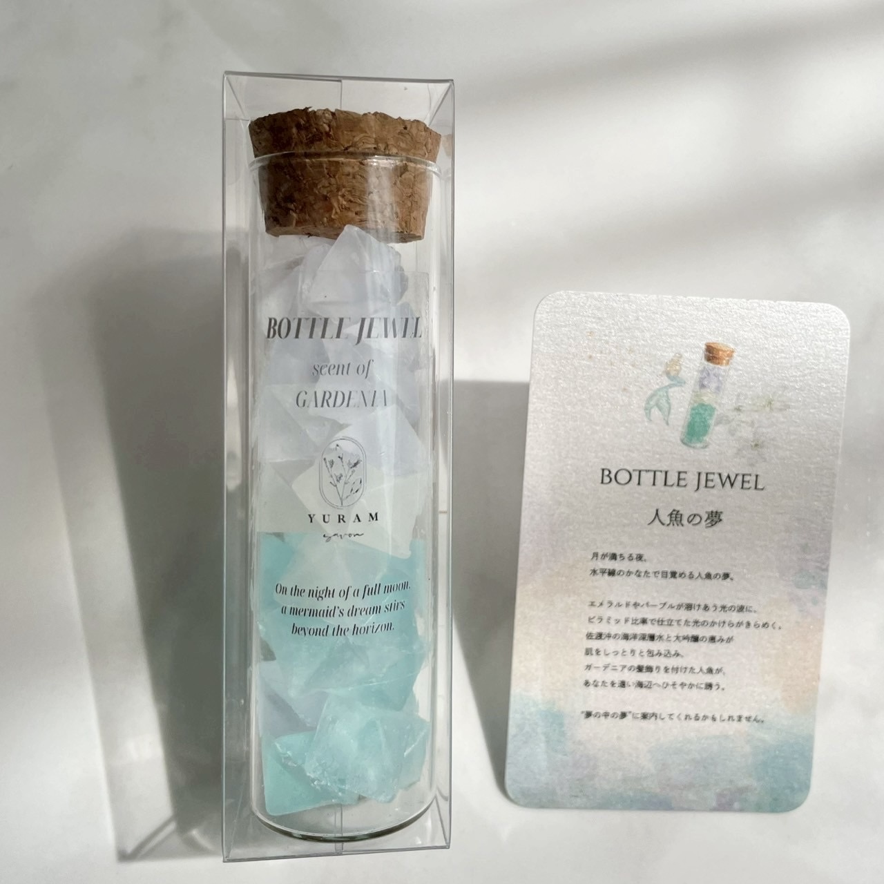 ブルー、パープル、ホワイトの宝石のかけらたち。 人魚が見た夢の断片を集めたような、美しく静かな世界を閉じ込めました。 香りは「ガーデニア」 “幸せを運ぶ” という花言葉をもつこの香りは、まるで海辺で過ごした夏の夜のように、穏やかで心をそっとをほぐしてくれます。