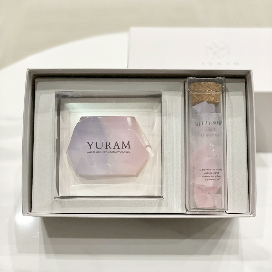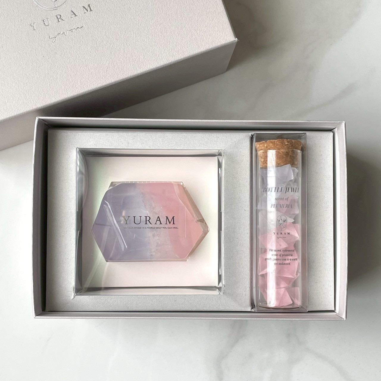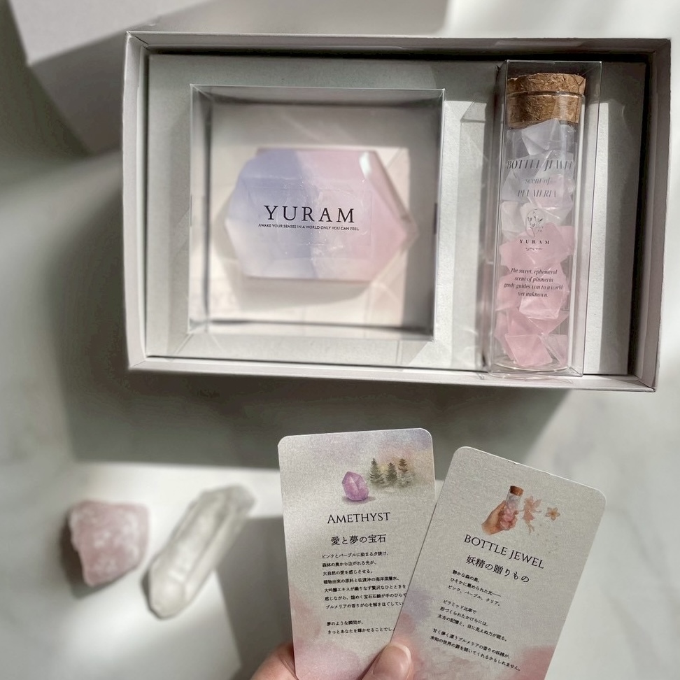 銀箔でYURAMロゴをあしらった、上質で重厚感のある専用ギフトボックスにお入れしてお届けします。 そのまま贈れる高級感のある仕上がりで、お誕生日・記念日・結婚祝い・お礼の品・内祝い・引き出物など、さまざまなギフトシーンにぴったりです。 各商品に物語を描いたストーリーカードを添えております。 幻想的な世界に心を重ねながら、夢の旅をお楽しみください。