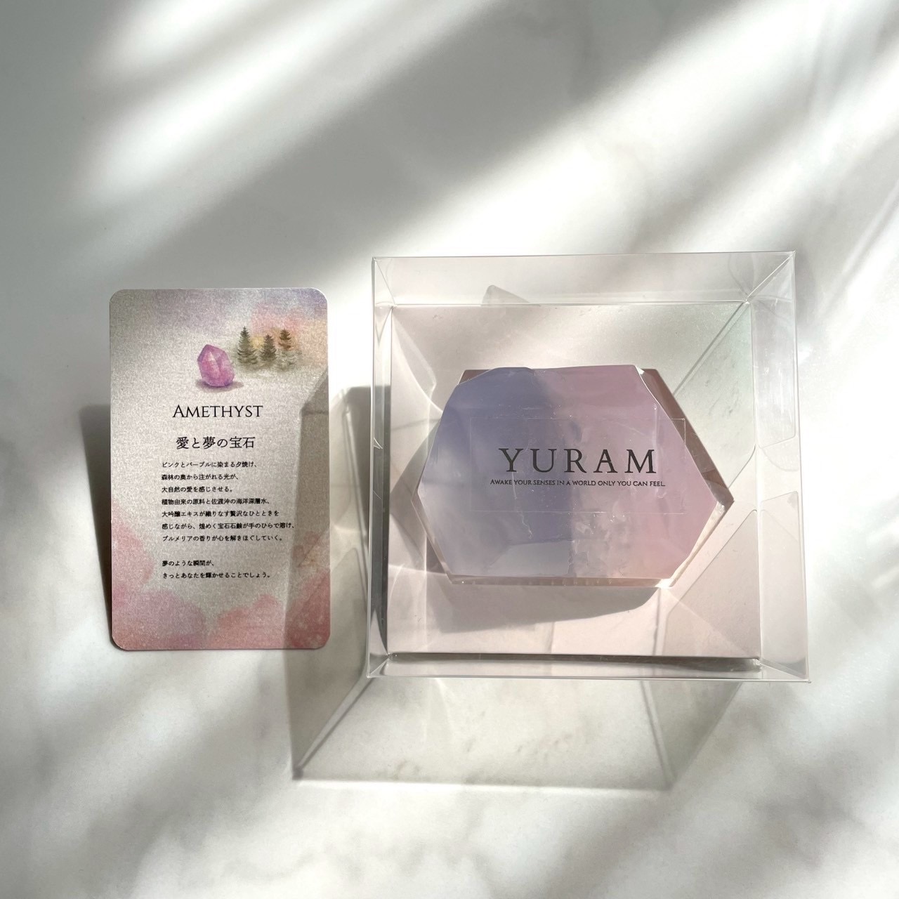 ピンクとパープルの幻想的なグラデーション。 静かな森に差し込む光のような、温かく優しい輝き。 大胆な宝石カットと天の川を思わせるシルバーラメが、見る角度によって様々な輝きを放ちます。 この石鹸には、アメジストのように穏やかな気品を込めました。 その石言葉は「心の平和」 手に取るたび、心が静かに整っていくような感覚をもたらしてくれます。 香りは南国の花「プルメリア」 気品とやさしさを感じさせる甘く澄んだ香りが、まるで夕暮れのリゾートに心を連れていってくれるようです。