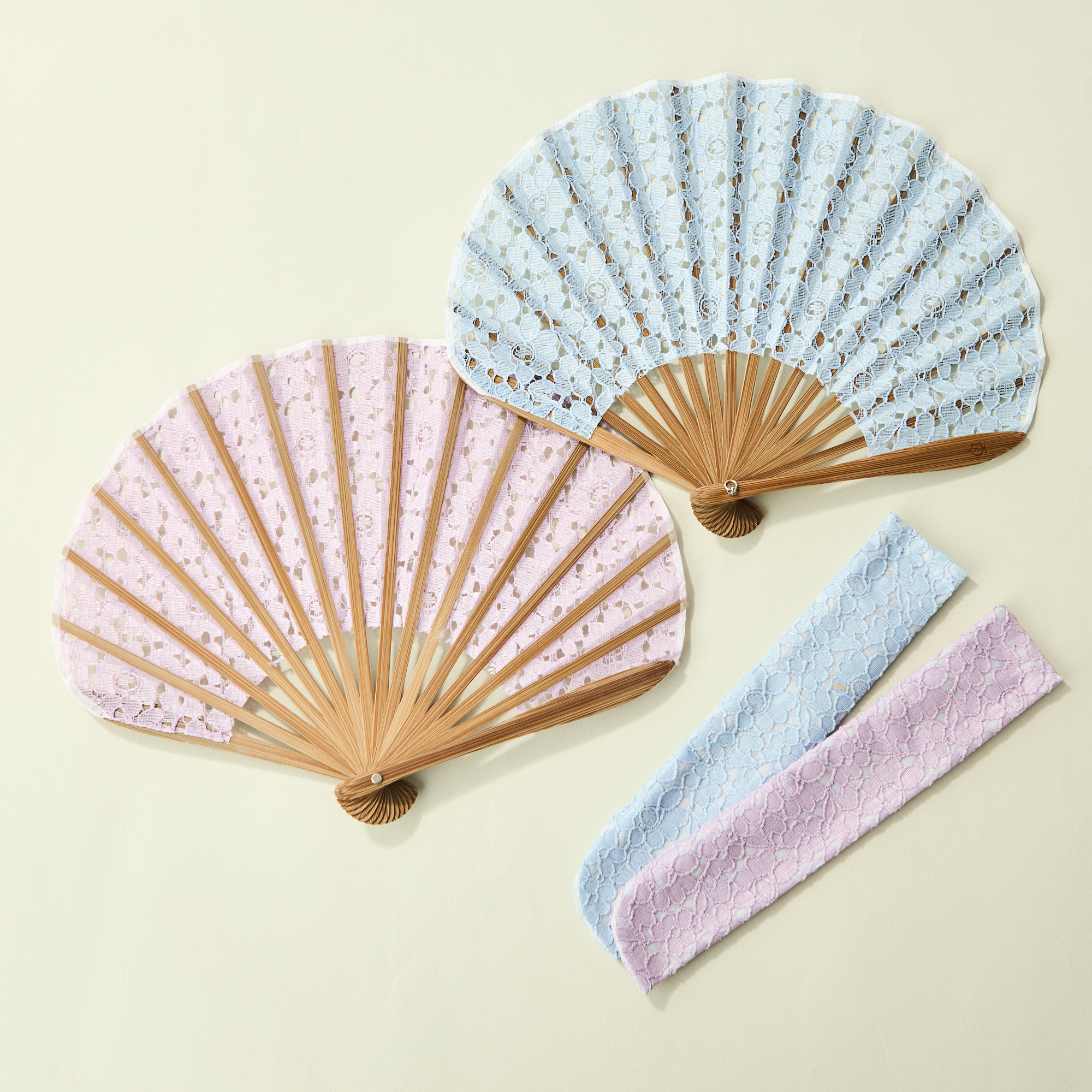 大口注文・法人のお問い合わせはこちら上品なレースデザインの涼しげな扇子です。 チャームを付けられる丸カン付き。