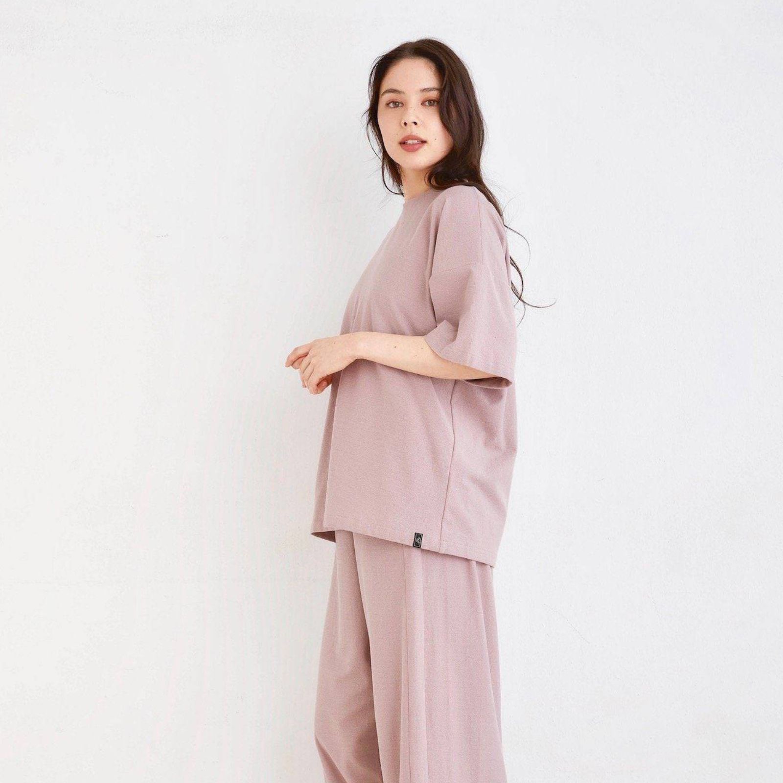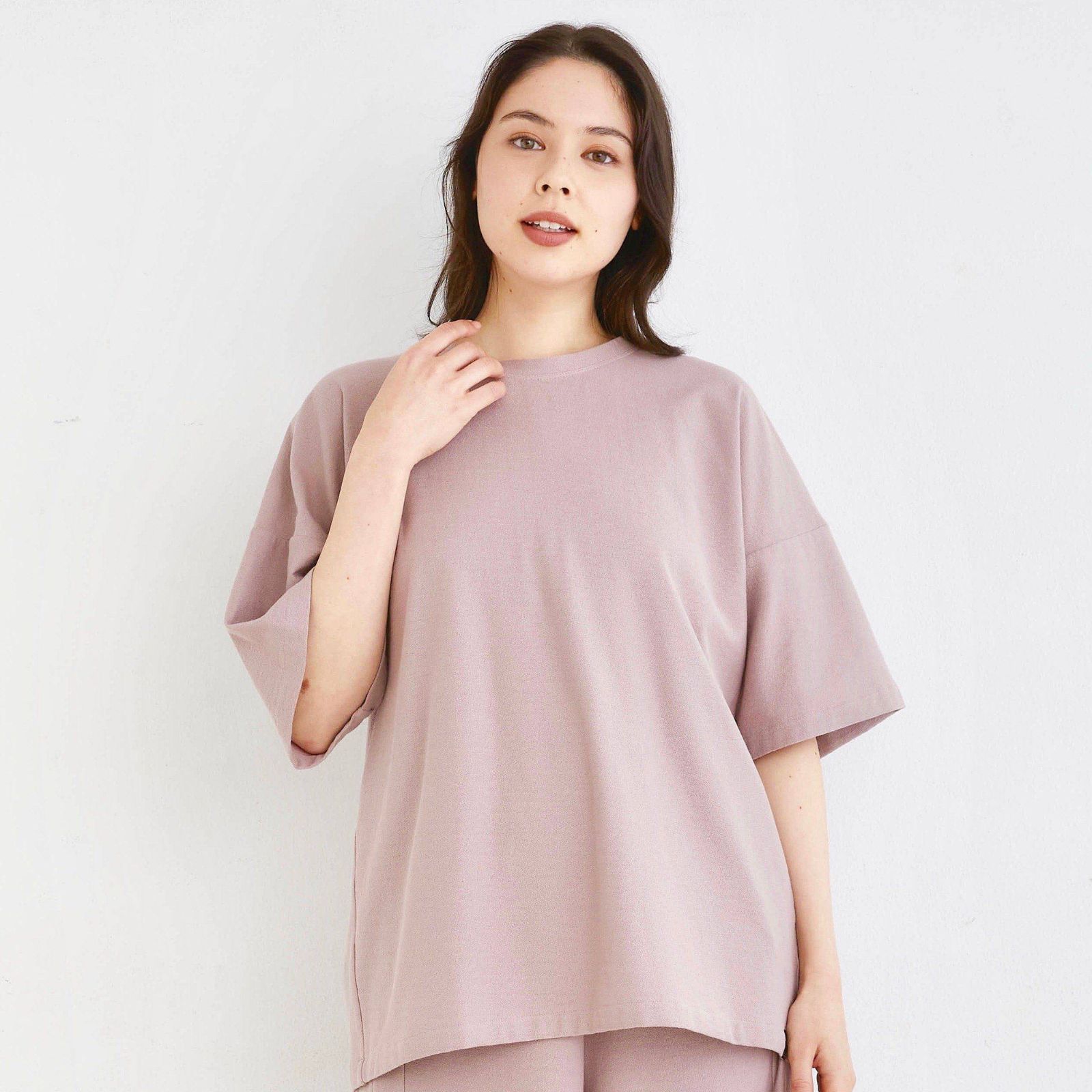 大口注文・法人のお問い合わせはこちらTシャツは身幅を広くとったゆったりしたデザインで、体を優しく包み込みます。襟元にはルームウェアとしては珍しい共布バイアスパイピングを施し、首元の不快感を軽減。 フォーマルウェアでも採用される ""梨地編み” 特有のハリコシが加わることで、その表情はエレガントに引き締まる。ビッグシルエットにありがちなダラしなさとは無縁の、上品なドレープを余すことなく堪能できる、他では味わえない美しさに。