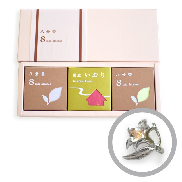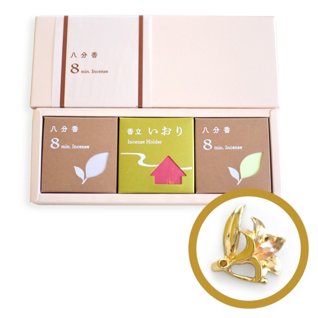 天然100%の「ホワイトセージ」と、アロマオイル配合の「カモミール」、香立いおり「フルール・ド・リス」のセット。専用の箱に入れてお届けするので、プレゼントにも最適です。八分香はその名の通り、燃焼時間がおよそ8分の短いお香です。隙間時間に、「香りの旅」へ。