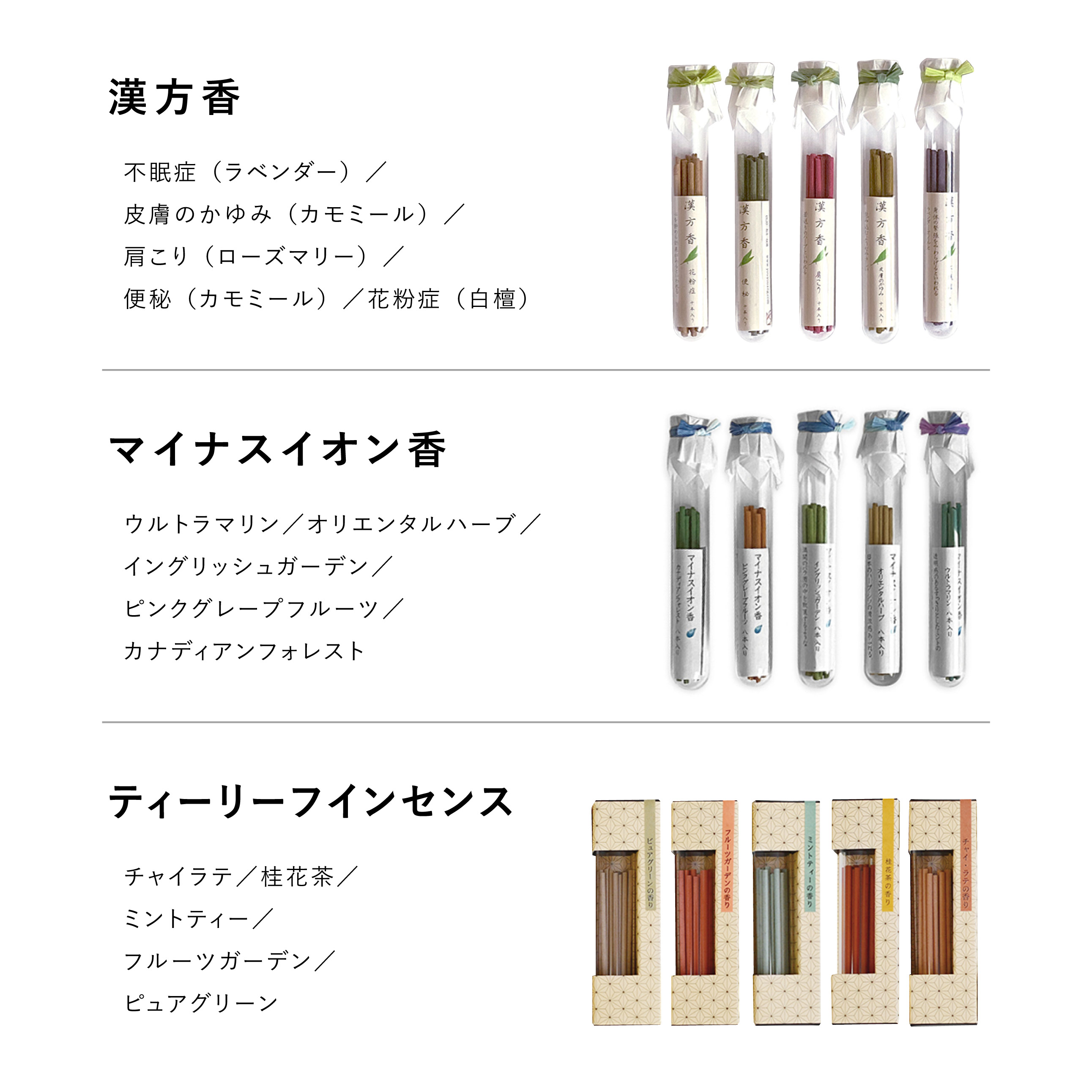 いろいろな香りを楽しめて、見た目にも美しいガラスビンのギフトセット。「飾りたくなる箱」をコンセプトに、ビンの収納にも細部までこだわりました。箱を立てて置くことができます。漢方香・マイナスイオン香・ティーリーフインセンスの3種類をご用意。お香立付きです。