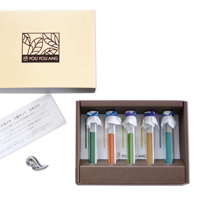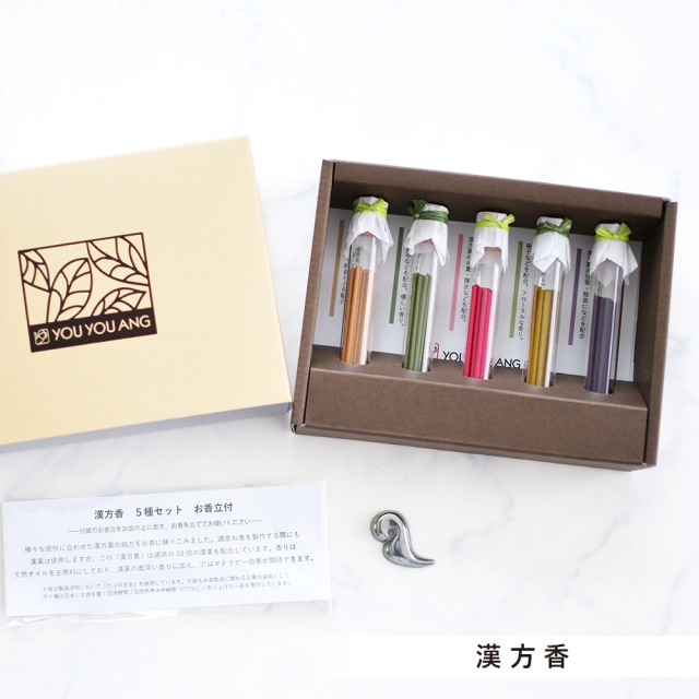 それぞれ細ビンが5本セットされて、お香立がついております。 注)【漢方香】には、健康の維持に良いとされる伝統的な薬草が含まれています。本品は医薬品ではなく、病気の診断・治療・予防を目的としたものではありません。摂取しないでください。