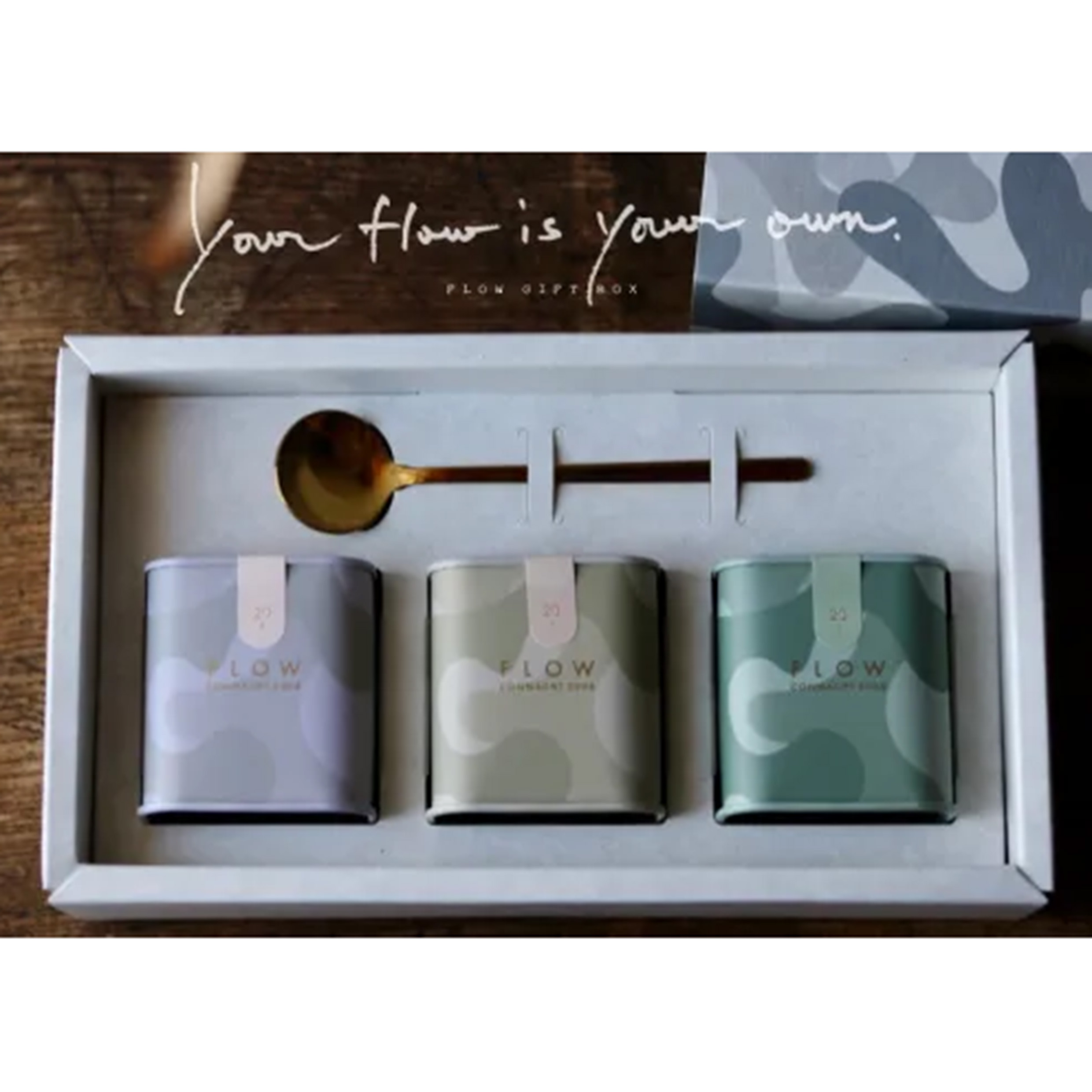 大口注文・法人のお問い合わせはこちらyour flow is your own - ながれのままに、あなたのままに - 無理せず自然体でいられる毎日を。 人気のFLOWシリーズ3種と専用ティーキャディースプーンをセットにしたギフトボックスです。