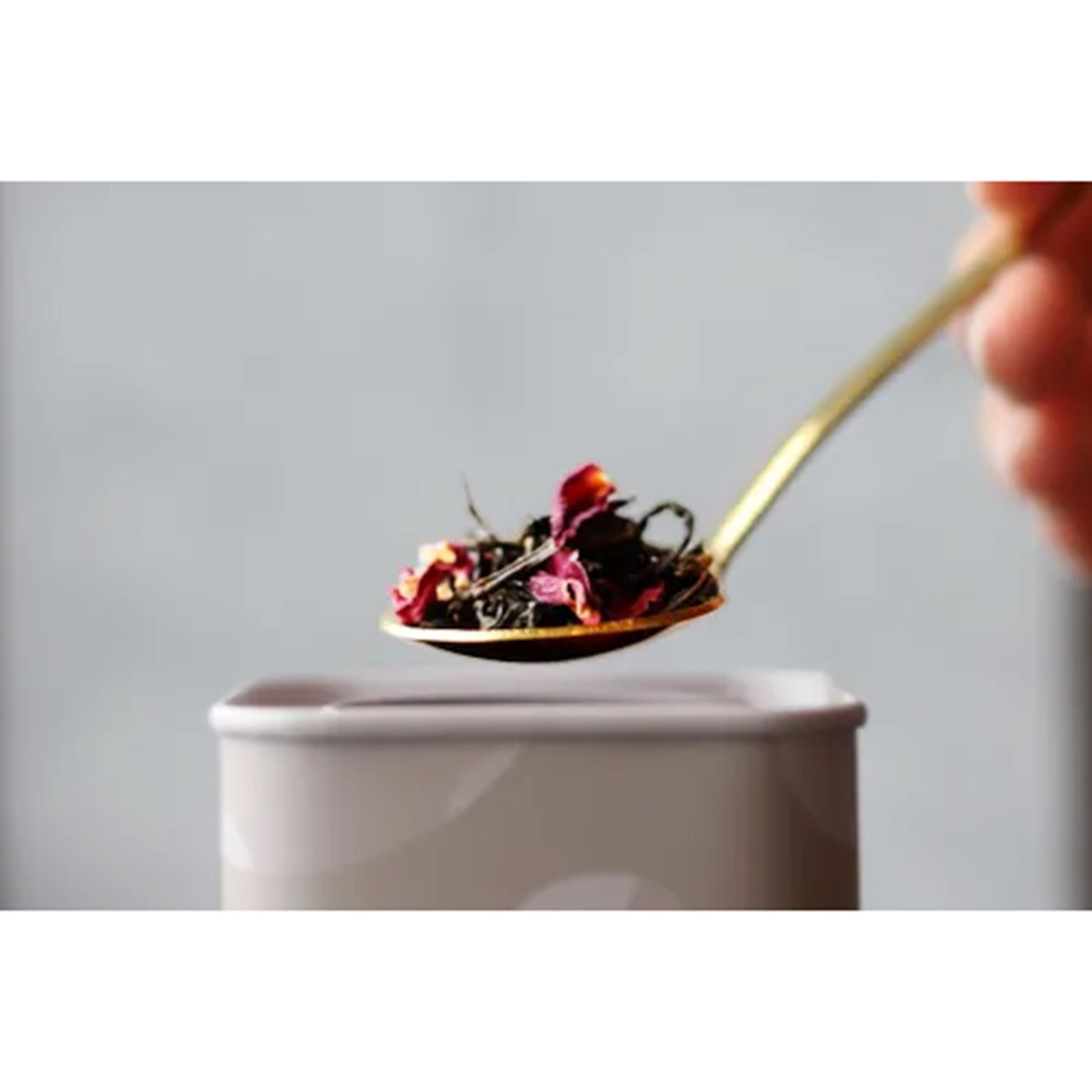 華やかで可愛らしい茶葉、小さいけど可愛らしくなりすぎず、子供っぽくない茶缶は、飲用後の使い方もいろいろ。付属のスプーンは小さな缶の開口部にピッタリ。 スプーンの取手は缶フタのオープナーにもなります。