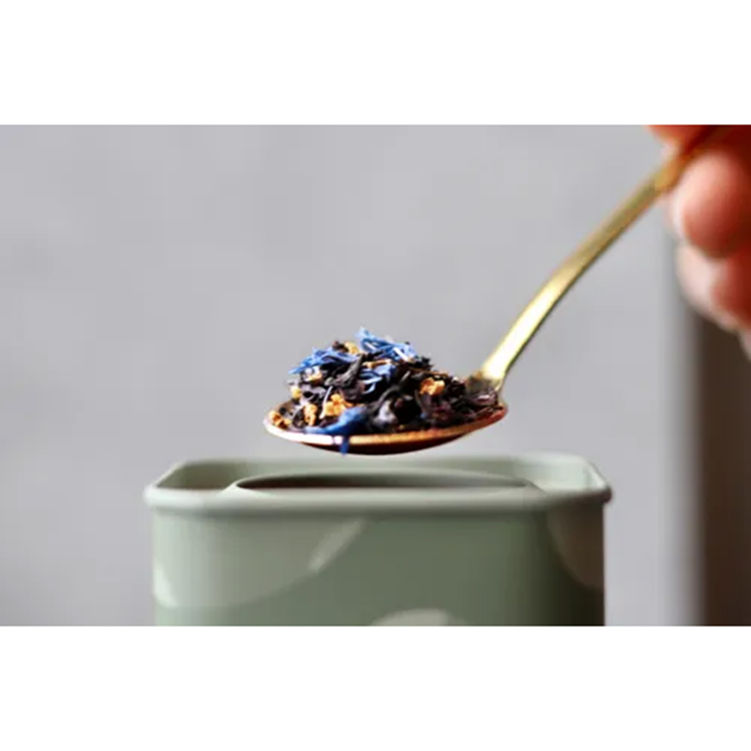 高品質なインド産紅茶にシシリー島原産の天然ベルガモット・フレーバー。デトックス効果の高いエルダーフラワーと青い矢車菊を散りばめた「ベルガモット・ブルー」です。(缶色:オリーブ) ベルガモットの香りには、ストレスや不安を和らげ、心を穏やかにする作用があります。 ・紅茶 ・エルダーフラワー ・コーンフラワー ・香料