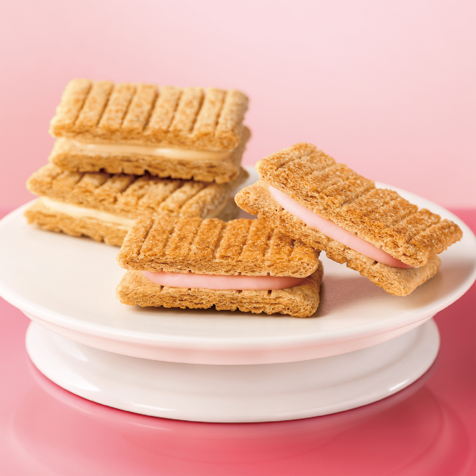 全粒粉やライ麦が香ばしい特製シリアル生地をシュガーバターでこんがり焼いてミルキー感が自慢のホワイトショコラをサンドしました。サクサク、ミルキーな味わいは、何度でも食べたくなるおいしさでずっと愛され続けています。