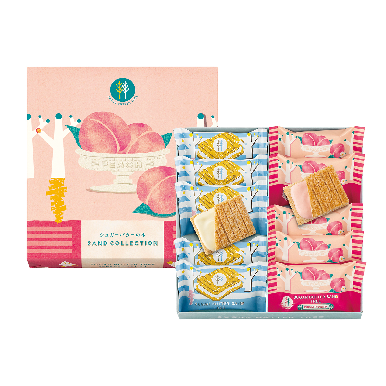 シリーズ一番人気の「シュガーバターサンドの木」に、季節限定の「白桃ミルクショコラ」をセットにしたひと箱。