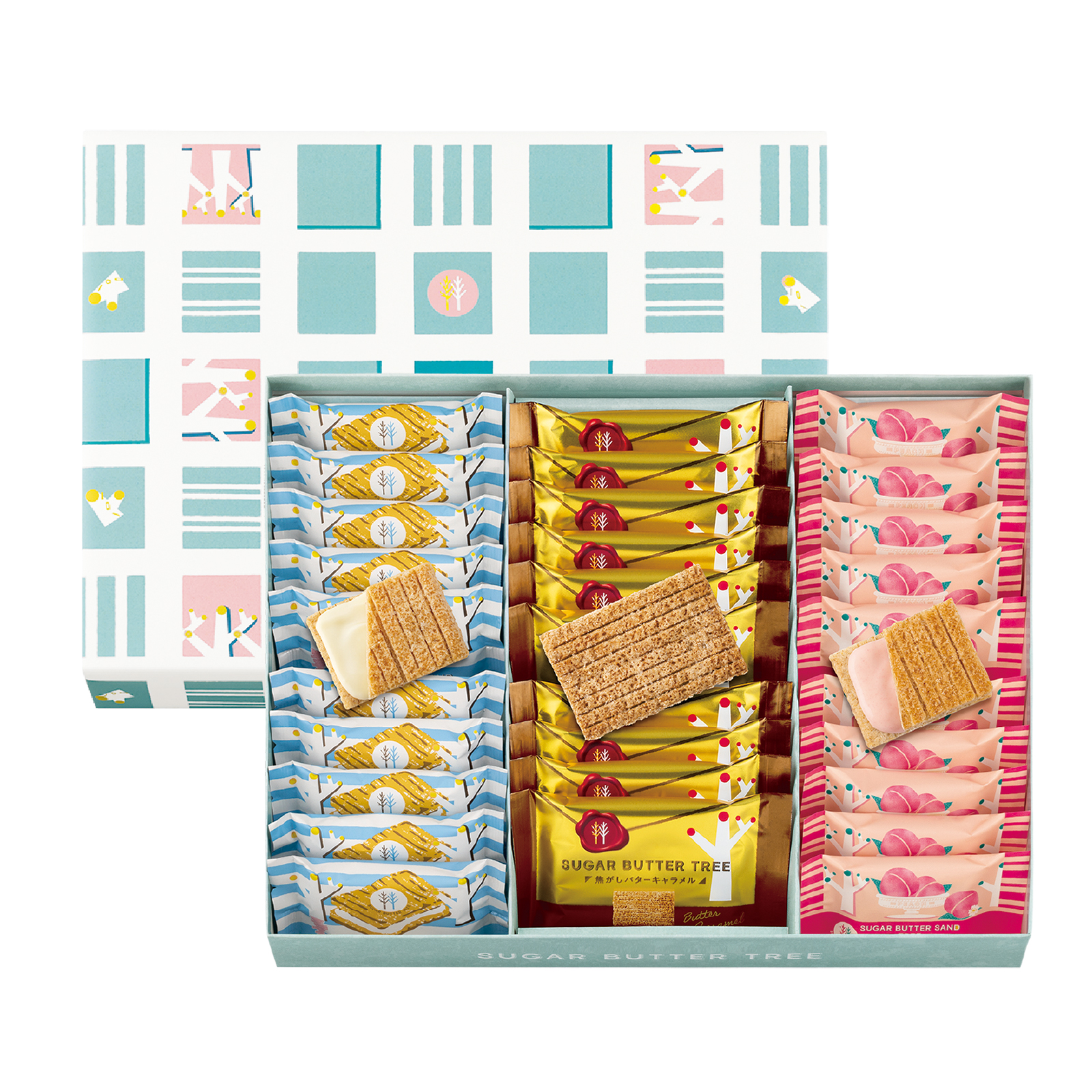 シリーズ一番人気の「シュガーバターサンドの木」に、季節限定の「白桃ミルクショコラ」と「シュガーバターの木 焦がしバターキャラメル」が入った華やかなひと箱。