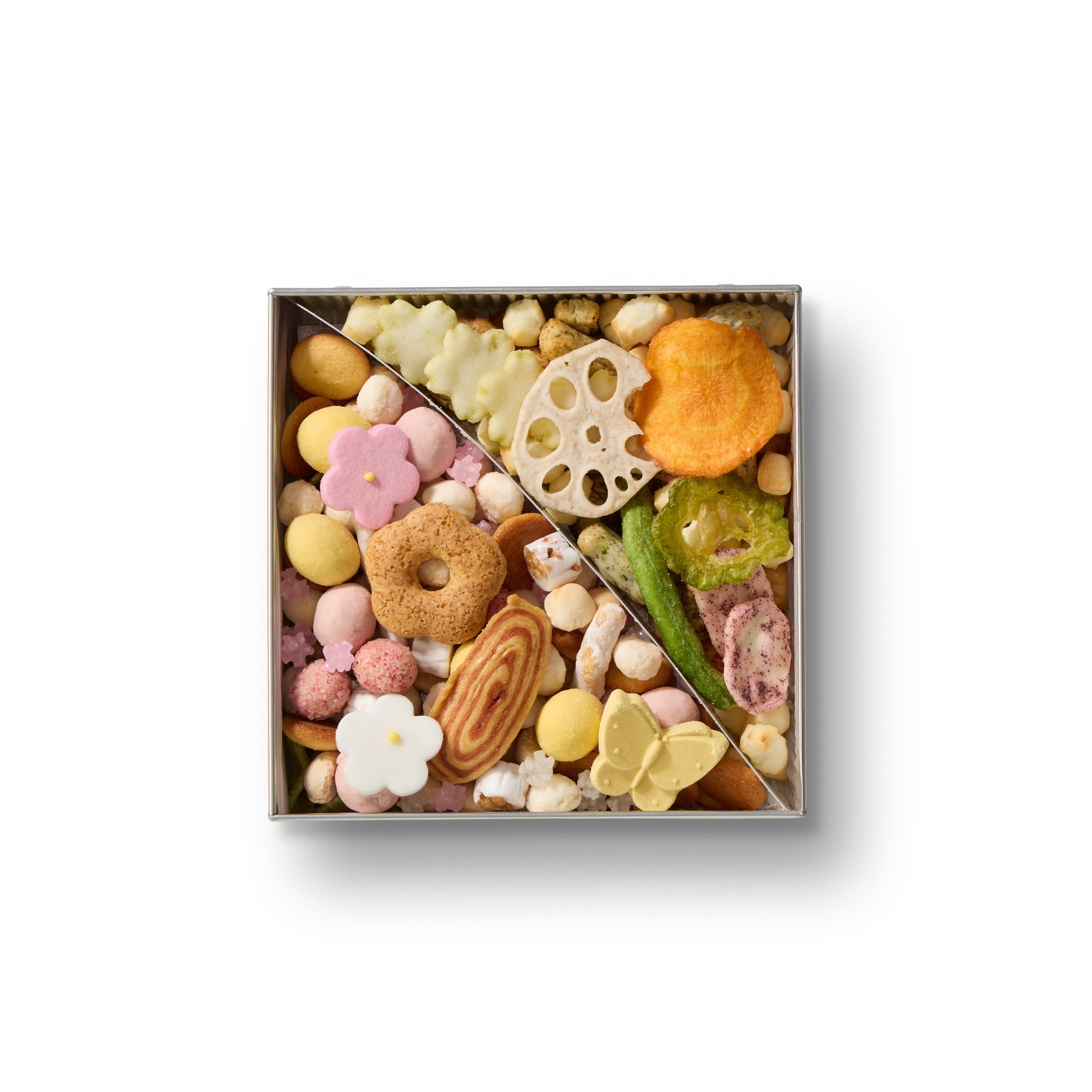 | 原材料 | ◾️甘いゾーン 【生姜ぼうろ】 小麦粉(国内製造)、澱粉、砂糖、水飴、鶏卵、生姜/香料、膨張剤 【ぼうろ】 小麦粉(国内製造)、砂糖、鶏卵、澱粉、マーガリン、全粉乳、ブドウ糖、食塩/乳化剤、カロチン色素、酸化防止剤(V.E)、香料、膨張剤 【金平糖白】 グラニュー糖(国内製造)/香料 【金平糖ピンク】 グラニュー糖(国内製造)/香料 、着色料(赤3) 【小梅豆】 砂糖(国内製造)、大豆、小麦粉、澱粉、寒梅粉、乾燥梅肉、澱粉分解物/安定剤(加工澱粉)、膨張剤、紅麹色素 【白樺かりんとう】 小麦粉(国内製造)、砂糖、植物油、澱粉、水飴、ショートニング、イースト、ゼラチン、食塩 【バナナ豆】 砂糖(国内製造)、落花生、全粉乳、寒梅粉ミックス(澱粉、もち米)、植物油脂、小麦粉、脱脂粉乳、澱粉、水飴、バナナ粉末/カロチン色素、膨張剤、香料 【いちごミルク豆】 砂糖(国内製造)、落花生、全粉乳、植物油脂、寒梅粉ミックス(澱粉、もち米)、小麦粉、脱脂粉乳、澱粉、水飴、いちご果汁パウダー/膨張剤、クチナシ色素、香料 【奉天ミニ白】 砂糖(国内製造)、小麦粉、水飴、植物油脂、パン酵母、食塩 【抹茶つまみ】 砂糖(国内製造)、小麦粉、鶏卵、上新粉、ぶどう糖、抹茶、脱脂粉乳、コーンスターチ 【笹かりんとう】 小麦粉(国内製造)、砂糖、植物油、水飴、イースト、食塩/紅麴色素、カカオ色素、膨張剤 【そばぼうろ】 小麦粉(国内製造)、砂糖、鶏卵、そば粉、蜂蜜/重曹 【雲平白】 砂糖(国内製造)、新寒梅粉ミックス、卵白/クチナシ色素(黄) 【雲平ピンク】 砂糖(国内製造)、新寒梅粉ミックス、卵白/アカビート色素、クチナシ色素(黄) 【和三盆】 和三盆糖(香川県製造)、澱粉/着色料(黄4) ◾️しょっぱいゾーン 【チーズあられ】 もち米(新潟県産)、植物油脂、ナチュラルチーズ、食塩、乳糖、デキストリン、砂糖、脱脂粉乳/カゼイン、リン酸ナトリウム、調味料(アミノ酸等)、乳化剤、香料、アナトー色素 【明太子豆】 落花生(米国産)、小麦粉、砂糖、澱粉、寒梅粉、明太子シーズニングパウダー、澱粉分解物、アミエビ、明太子風味調味料/安定剤(加工澱粉)、調味料(アミノ酸等)、膨張剤、炭末色素、パプリカ色素、紅麹色素、乳化剤 【黒豆おかき】 もち米(新潟県産)、黒大豆、植物油脂、食塩 【青のりあられ】 もち米(新潟県産)、醤油、アオサ、澱粉分解物、砂糖、醸造調味料、青のり、本みりん、ちりめんエキス、昆布エキス/調味料(アミノ酸等)、増粘剤(加工澱粉)、酸味料 【柚子胡椒豆】 そら豆(中国産)、小麦粉、砂糖、澱粉、植物油脂、寒梅粉、ゆず、食塩、唐辛子、醤油、ベース調味料、発酵調味料/安定剤(加工澱粉)、膨張剤、香料、酸化防止剤(V.C)、増粘剤(キサンタン)、クチナシ色素 【昆布豆】 落花生(米国産)、小麦粉、砂糖、澱粉、昆布加工品、寒梅粉、澱粉分解物、醤油、食塩、粉末昆布、植物油脂、ベース調味料、赤唐辛子/安定剤(加工澱粉)、植物炭末色素、膨張剤 【しそ煎餅】 うるち米(新潟県産)、砂糖、赤しそ、梅干パウダー、食塩、梅酢/紅麹色素 【さくらあられ枝豆味】 もち米(新潟県産)、植物油脂、砂糖、ぶどう糖、食塩、グリーンピースパウダー、デキストリン、きな粉、酵母エキスパウダー、昆布エキスパウダー/調味料(アミノ酸等)、香料、酸味料 【インゲンチップス】 インゲン(中国産)、麦芽糖、植物油脂 【人参チップス】 にんじん(中国産)、麦芽糖、植物油脂 【レンコンチップス】 れんこん(中国産)、植物油脂、食塩、麦芽糖/酸化防止剤(V.E) 【ゴーヤチップス】 ゴーヤ(ベトナム産)、植物油脂、マルトデキストリン、食塩 |