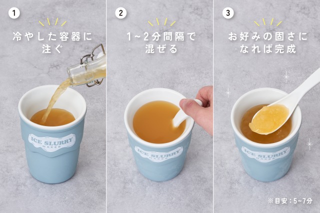 事前に本体を冷凍庫で約10時間冷やしたら、ドリンクを入れて付属のスプーンで5~7分程かき混ぜるだけ。美味しいアイススラリーが完成します。