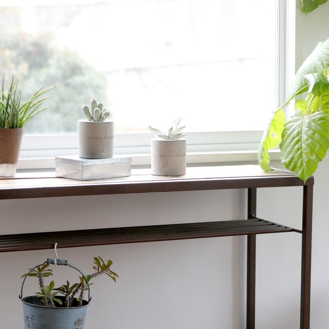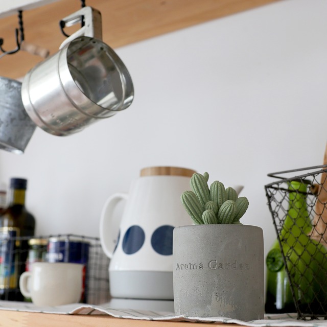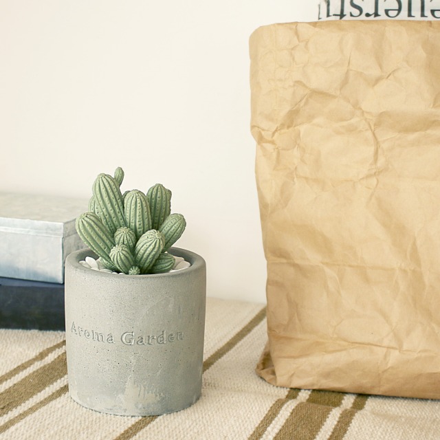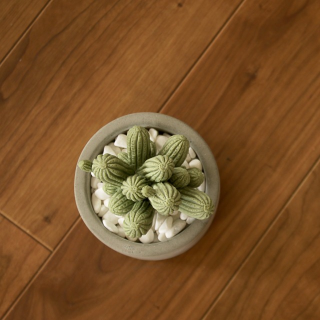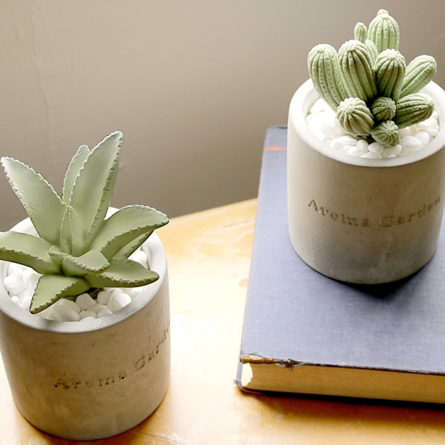 無機質なセメントのカップに入った、まるで本物のようなかわいい2種類のサボテンからは、それぞれ華やかないい香りが。 白い小石を敷き詰めてあるところも本物らしく見えるポイントです。