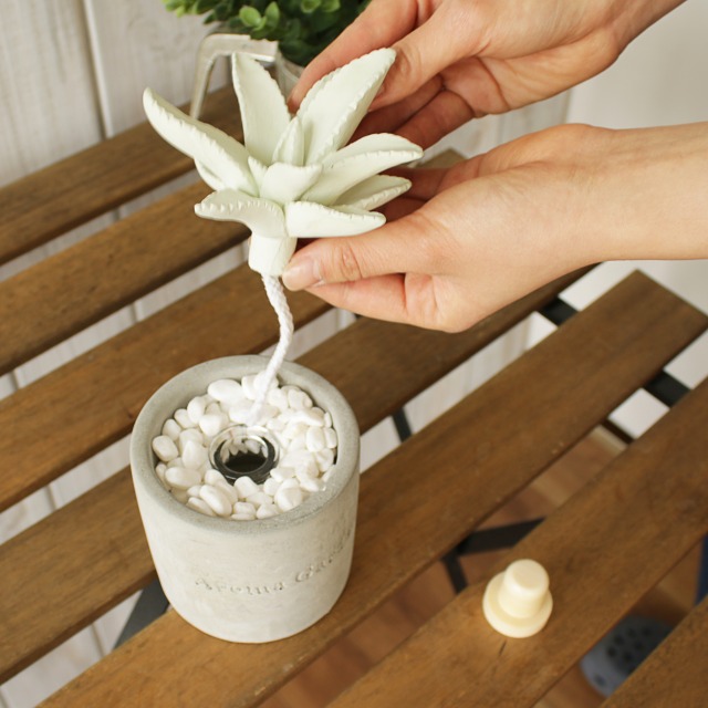 | 使用方法 | 本品フレグランスボトルのふたを開け、セメントカップへセット後、石をフレグランスボトルが隠れるようにかぶせ、プラスターリードをフレグランスに挿してください。しばらくするとフレグランスオイルがプラスターリードに染み込み、お部屋に香りが広がります。 |