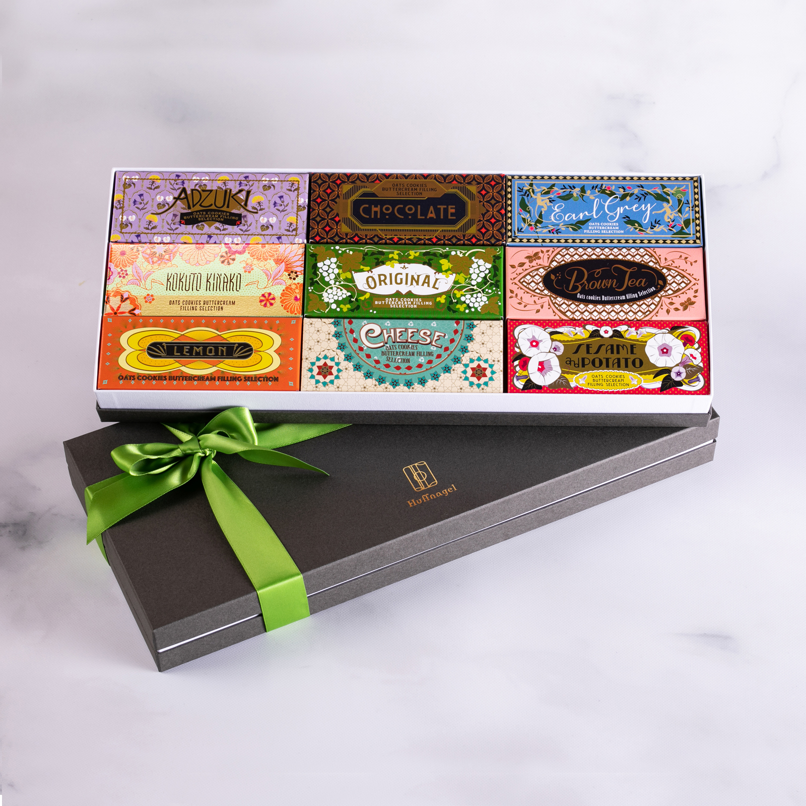 感性と記憶に触れる体験を洋菓子で表現するブランド「Huffnagel(フフナーゲル)」の上質な化粧箱に並ぶ9種のバターサンドは、まるで洋菓子のジュエリー。芳醇なクリームとしっとりクッキーが織りなす、格別の味わいです。