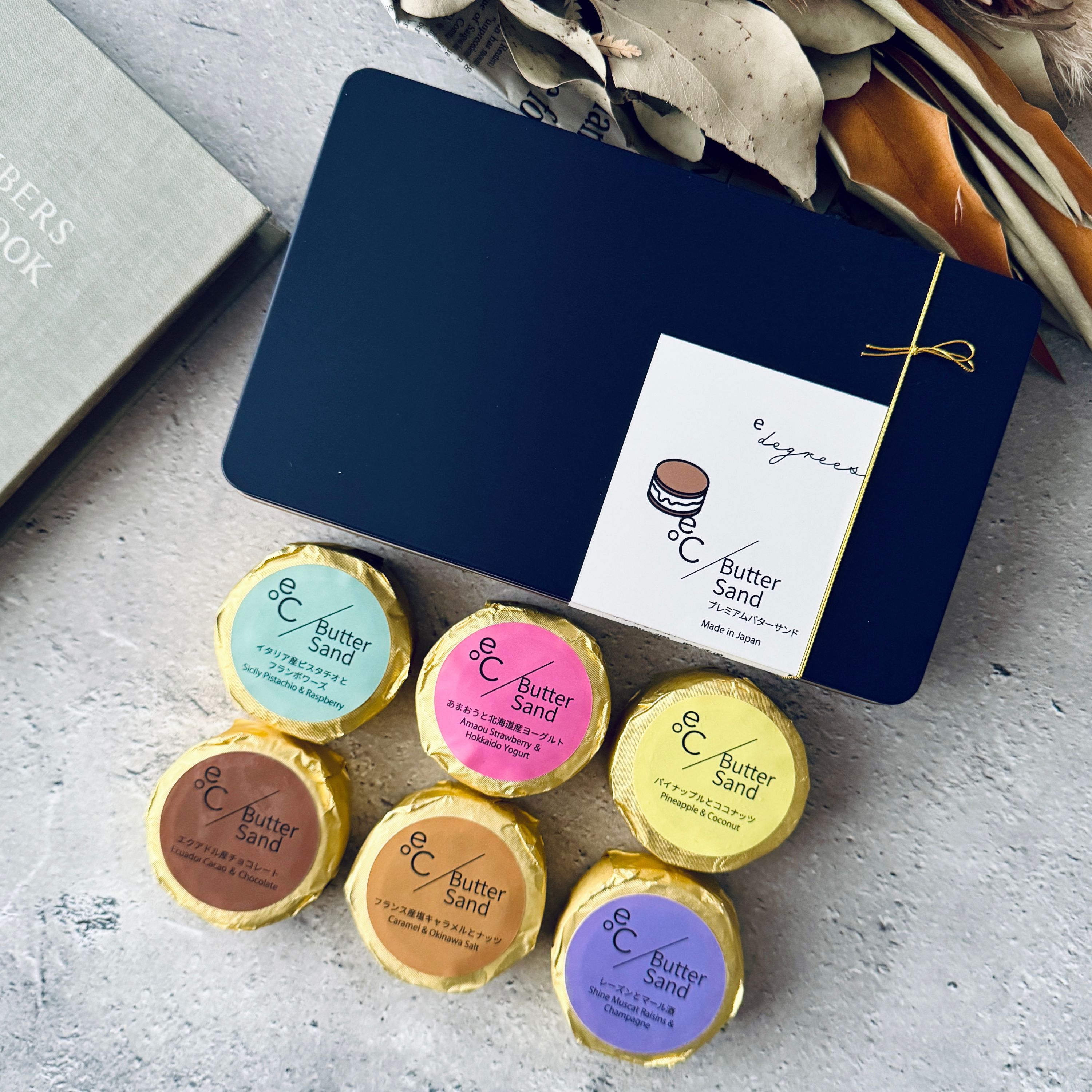 大口注文・法人のお問い合わせはこちら北海道産の最高級バターを使用した、プレミアムバターサンドのフレーバー 6種類 x 各1個セットです。 冷凍で食べると、ザクザクとした食感で、まるでアイスを食べているような感覚に。少し解凍すると、バタークリームがバスク生地に染み込み、滑らかでしっとりとした食感になり、2通りの楽しみ方が可能です。