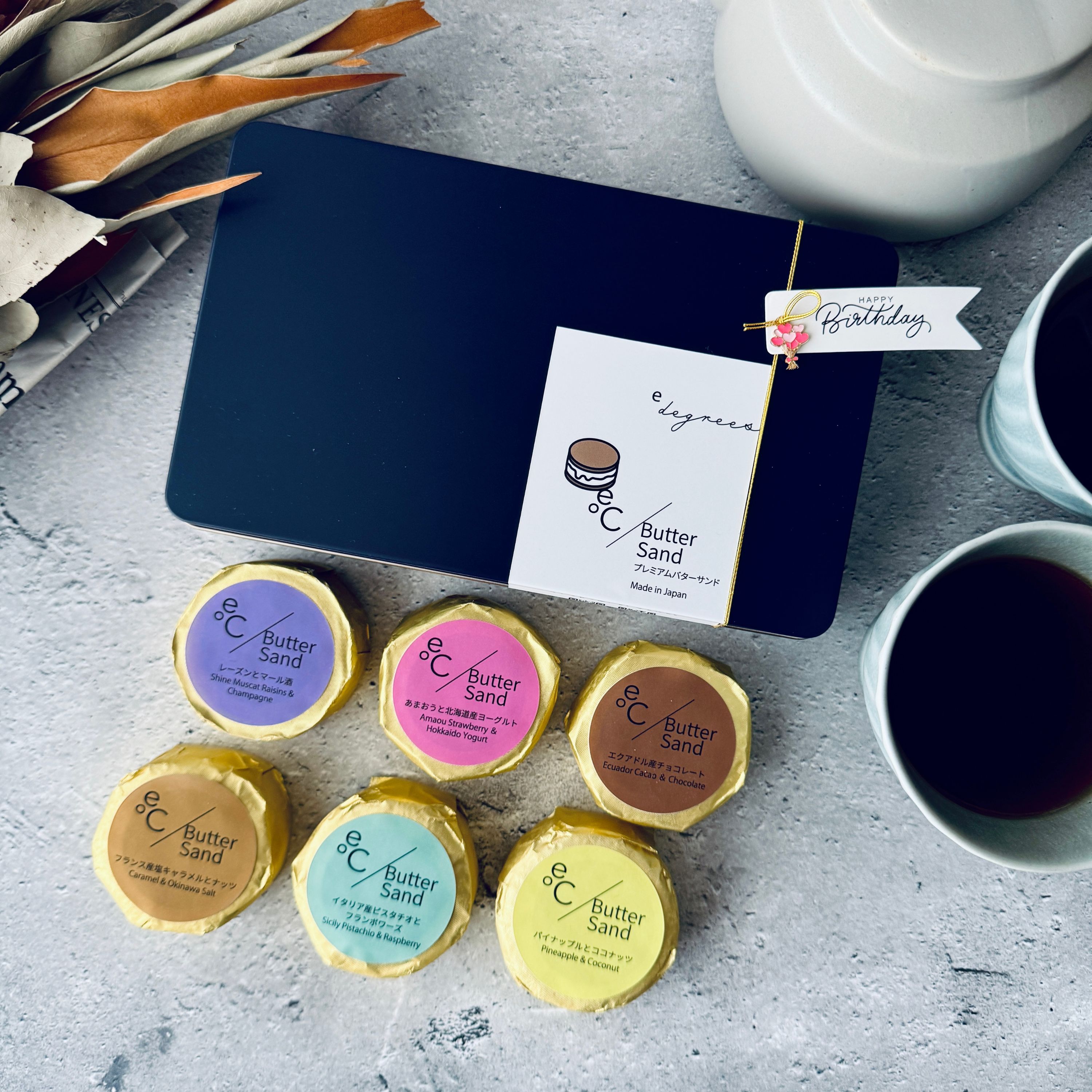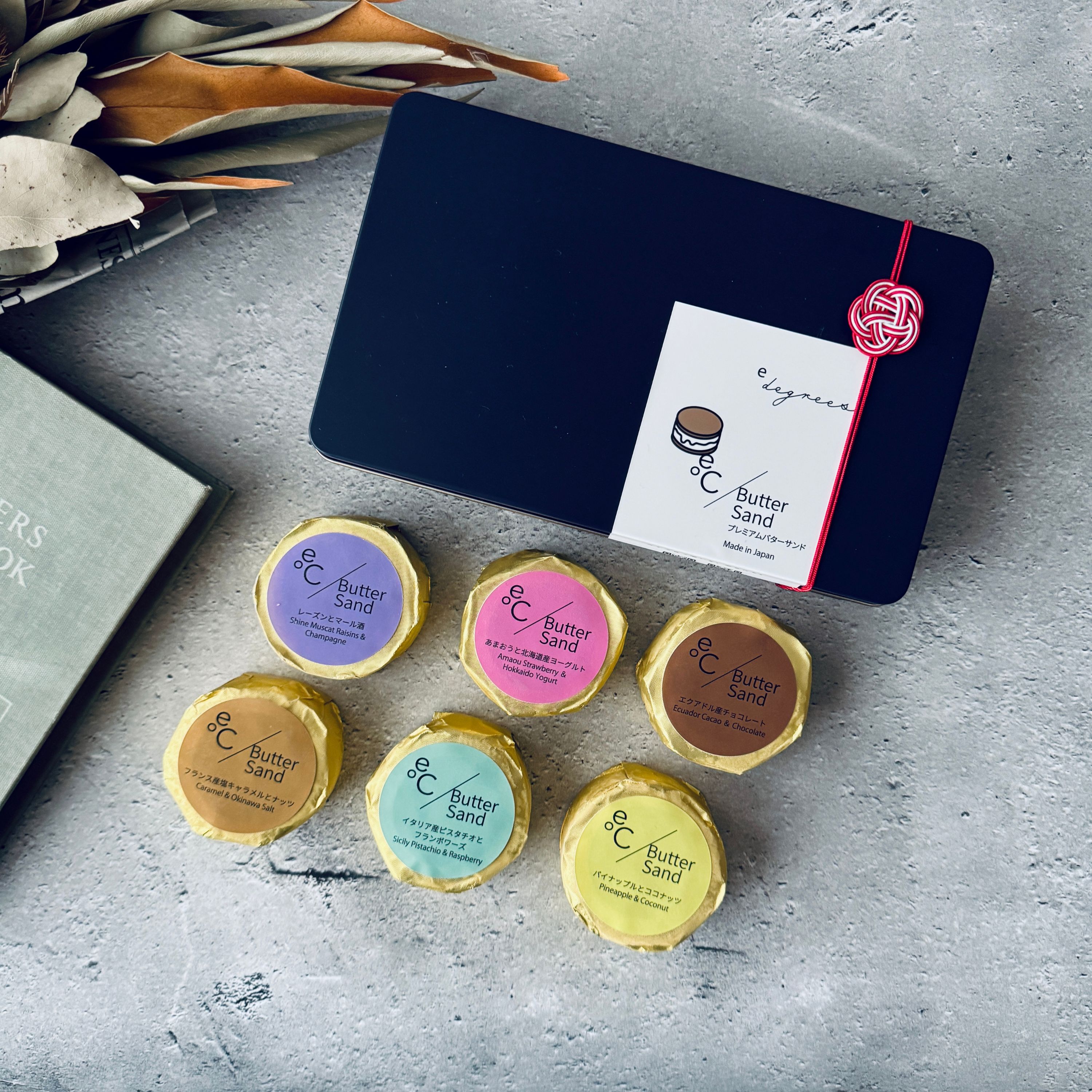 シンプルな厳選素材を使用した洋菓子ブランド「e℃(イード)」の北海道産の高級バターを使用した、プレミアムバターサンドのフレーバー6種詰め合わせ。冷凍で食べると、アイスのようなザクザク食感。解凍すると、バタークリームがバスク生地に染み込み、滑らかしっとり食感。