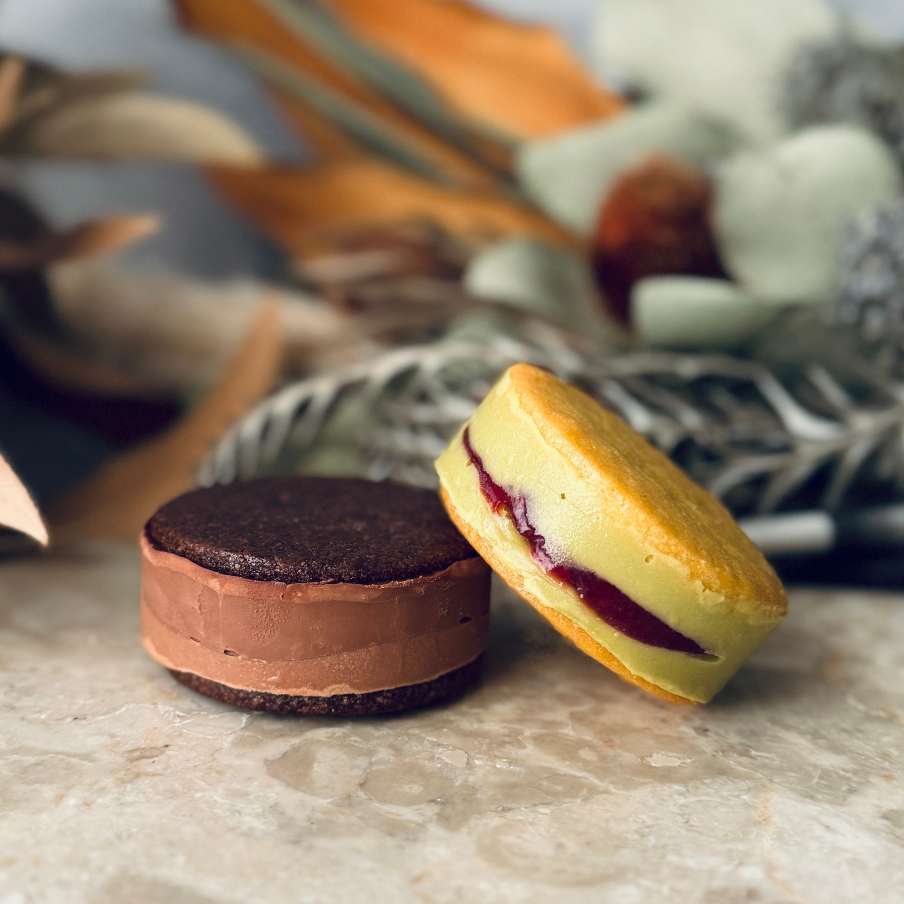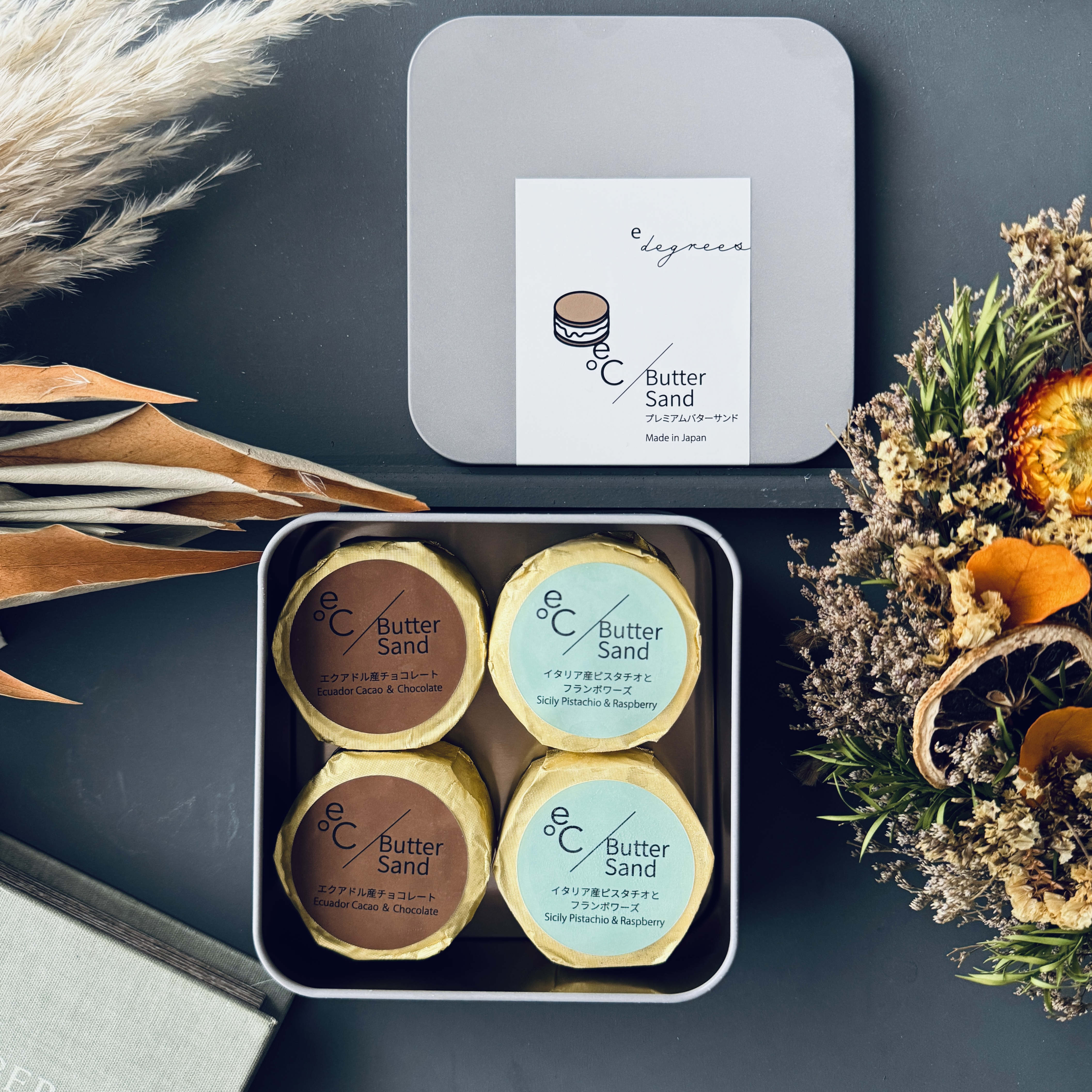 大口注文・法人のお問い合わせはこちら北海道産の最高級バターを使用した、プレミアムバターサンドのフレーバー 2種類 x 各2個セットです。 冷凍で食べると、ザクザクとした食感で、まるでアイスを食べているような感覚に。少し解凍すると、バタークリームがバスク生地に染み込み、滑らかでしっとりとした食感になり、2通りの楽しみ方が可能です。