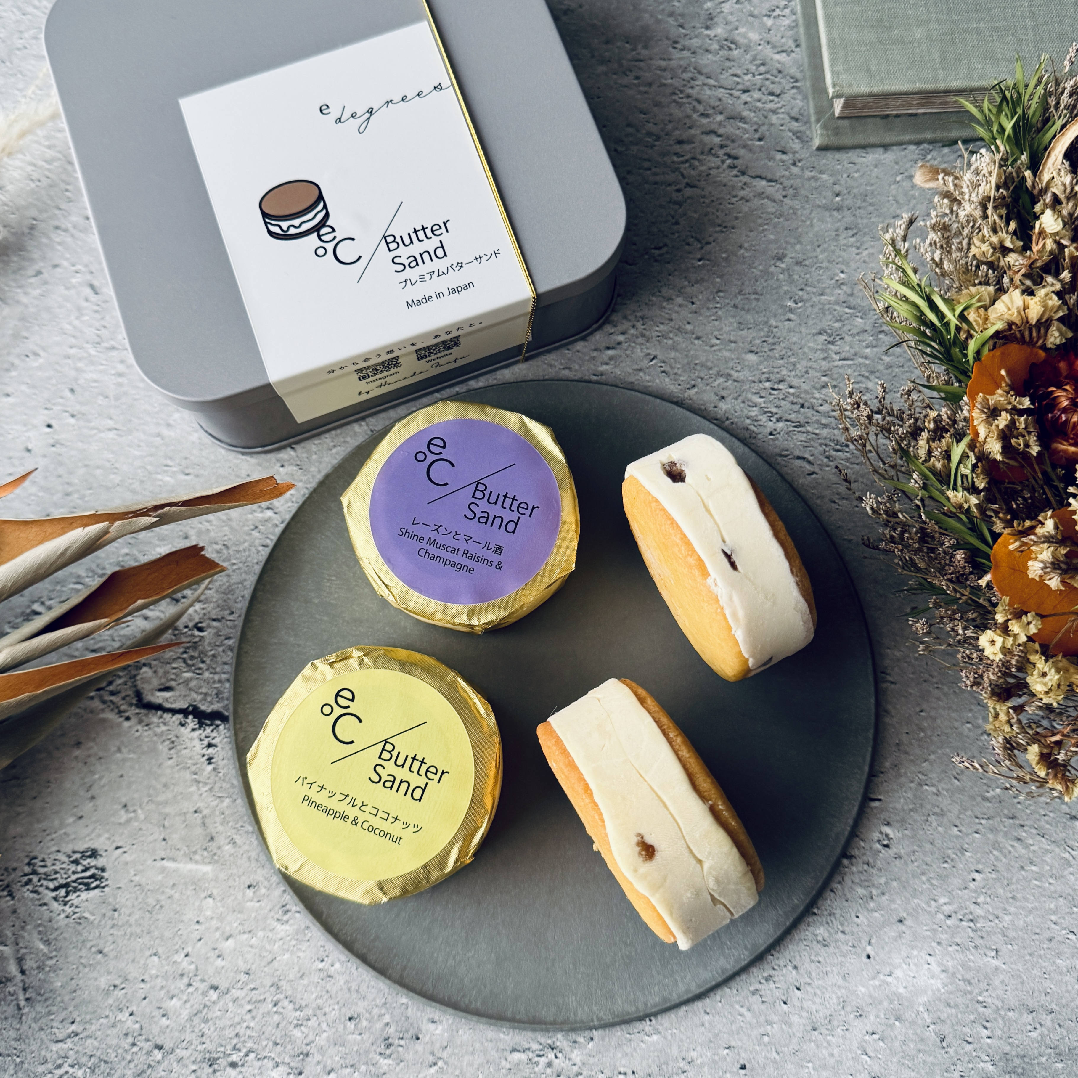 シンプルな厳選素材を使用した洋菓子ブランド「e℃(イード)」の北海道産の高級バターを使用した、プレミアムバターサンドのフレーバー2種セット。冷凍で食べると、アイスのようなザクザク食感。解凍すると、バタークリームがバスク生地に染み込み、滑らかしっとり食感。