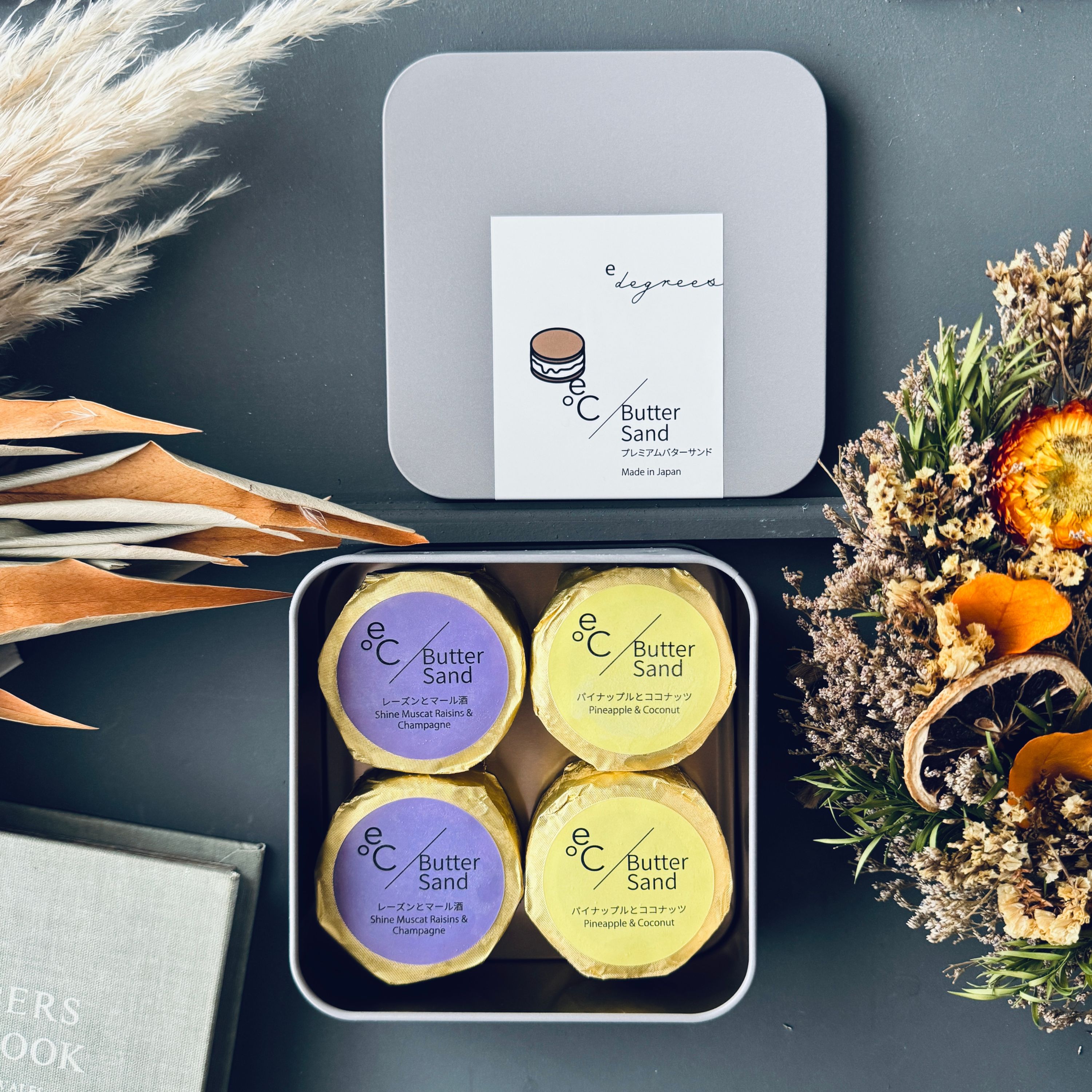 大口注文・法人のお問い合わせはこちら北海道産の高級バターを使用した、プレミアムバターサンドのフレーバー 2種類 x 各2個セットです。 冷凍で食べると、ザクザクとした食感で、まるでアイスを食べているような感覚に。少し解凍すると、バタークリームがバスク生地に染み込み、滑らかでしっとりとした食感になり、2通りの楽しみ方が可能です。