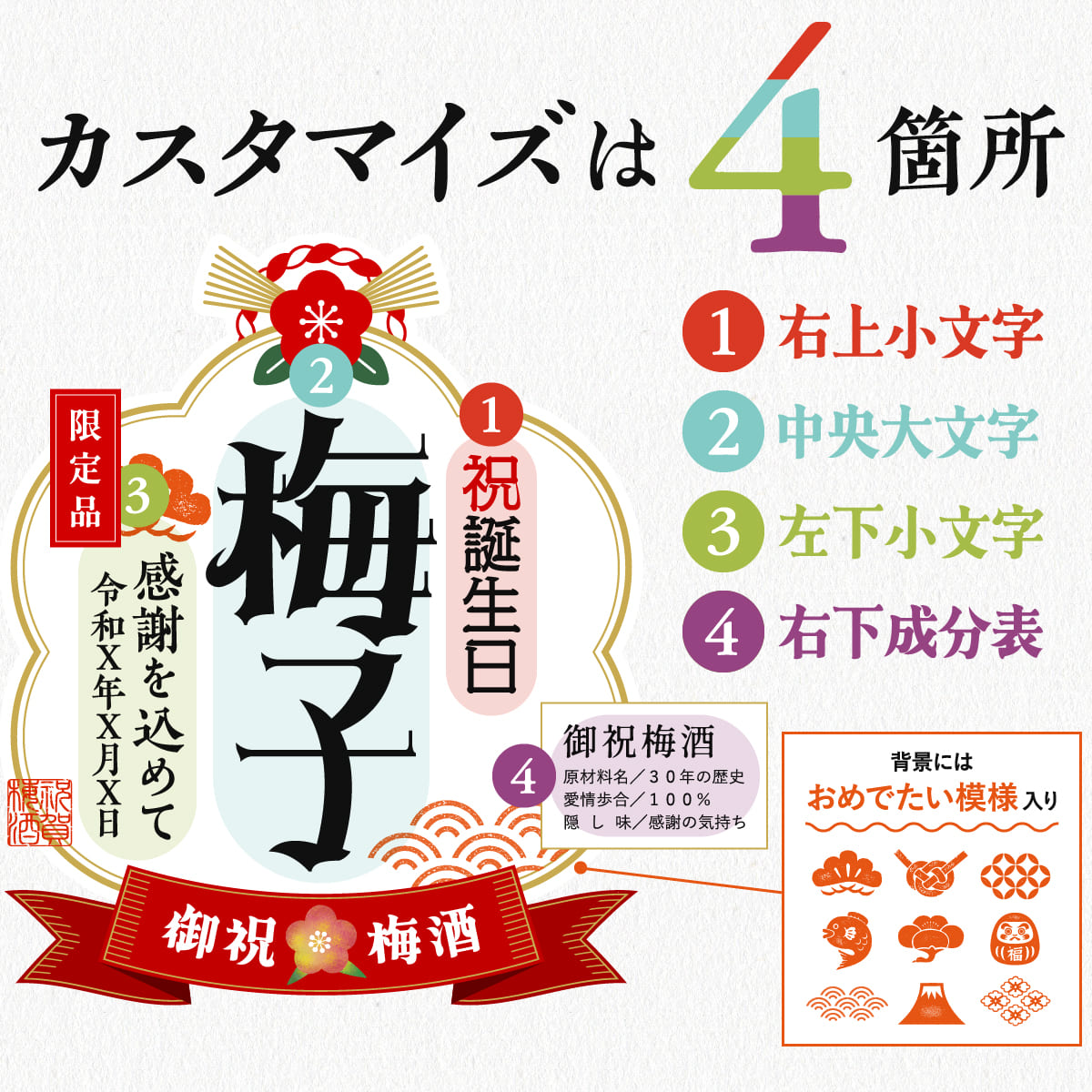 大口注文・法人のお問い合わせはこちらお名前やお祝いのメッセージを入れて、オリジナルの梅酒ラベルをお作りします。 お相手のことを大切に思う、あなたにしか作れない特別なギフトをお届けします。