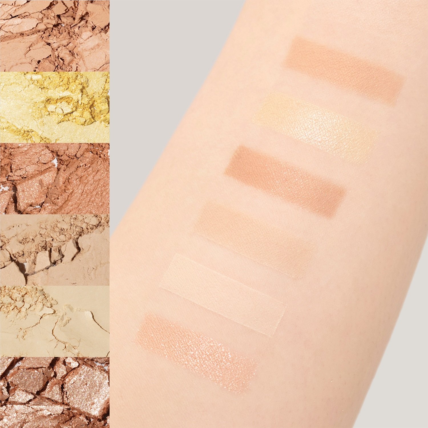 色のニュアンスによりくすみ消し効果や立体感コントロールを極めたパレット。前回のコレクションで高い支持を集め、石井さん自身が底見えを何度も繰り返すほど愛用する左上のマットなコーラルベージュをはじめ、イエローやブラウンのニュアンスを含むベージュカラーで、まぶたと一体化するかのようになじむのに、印象的な大人の洗練アイに。